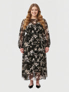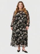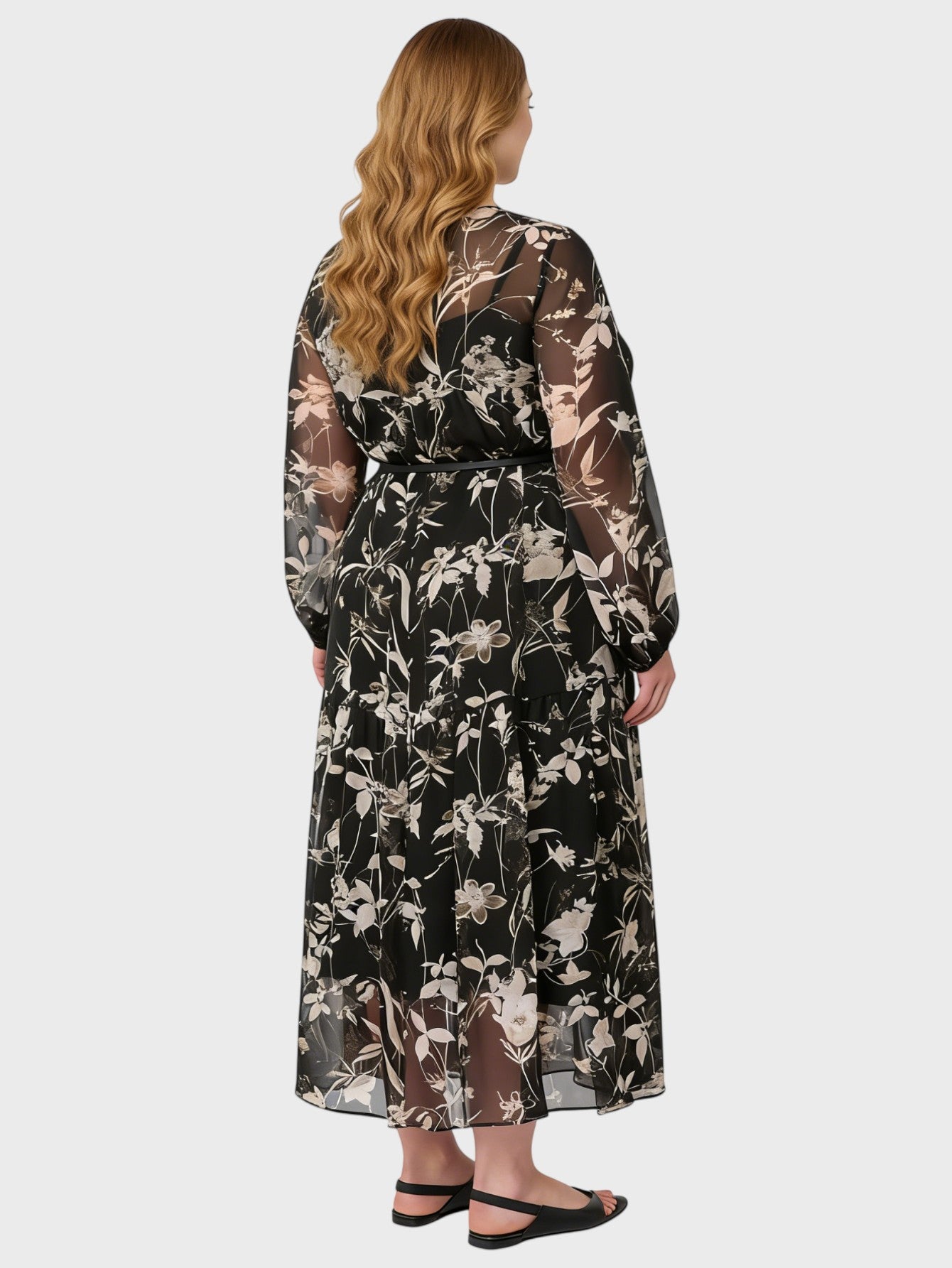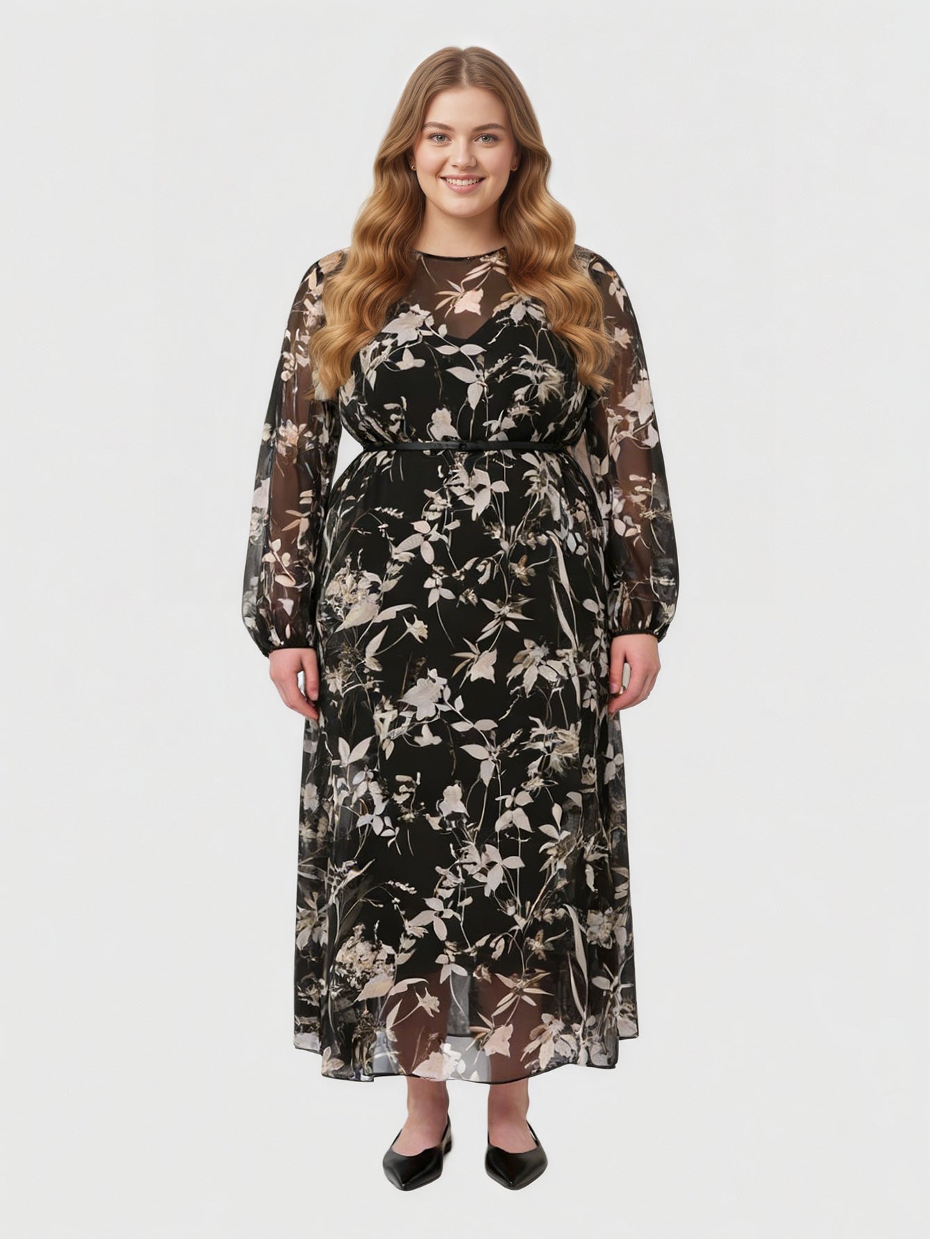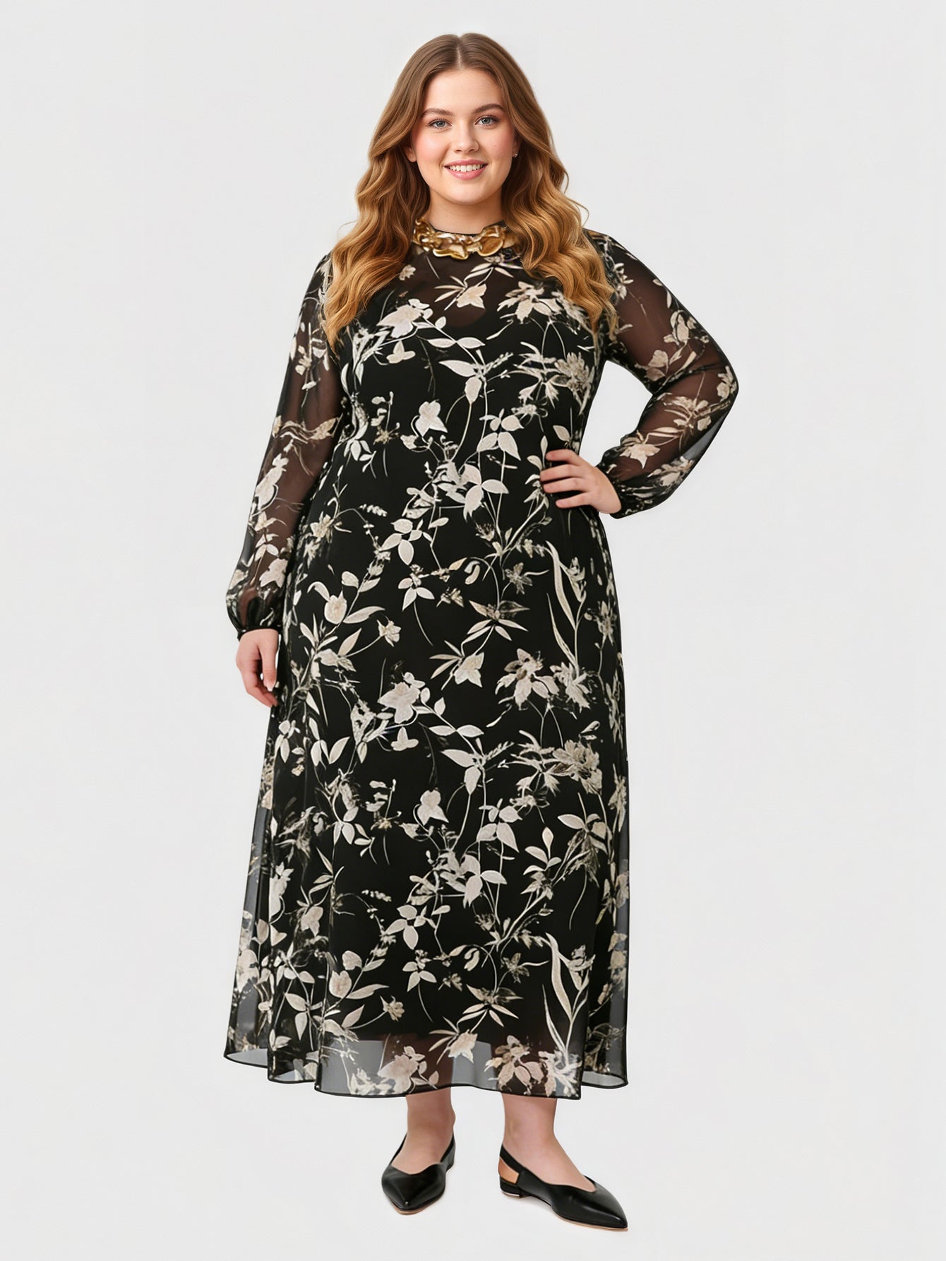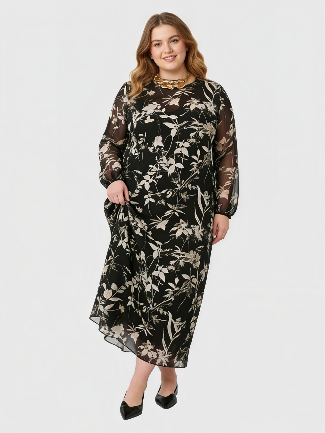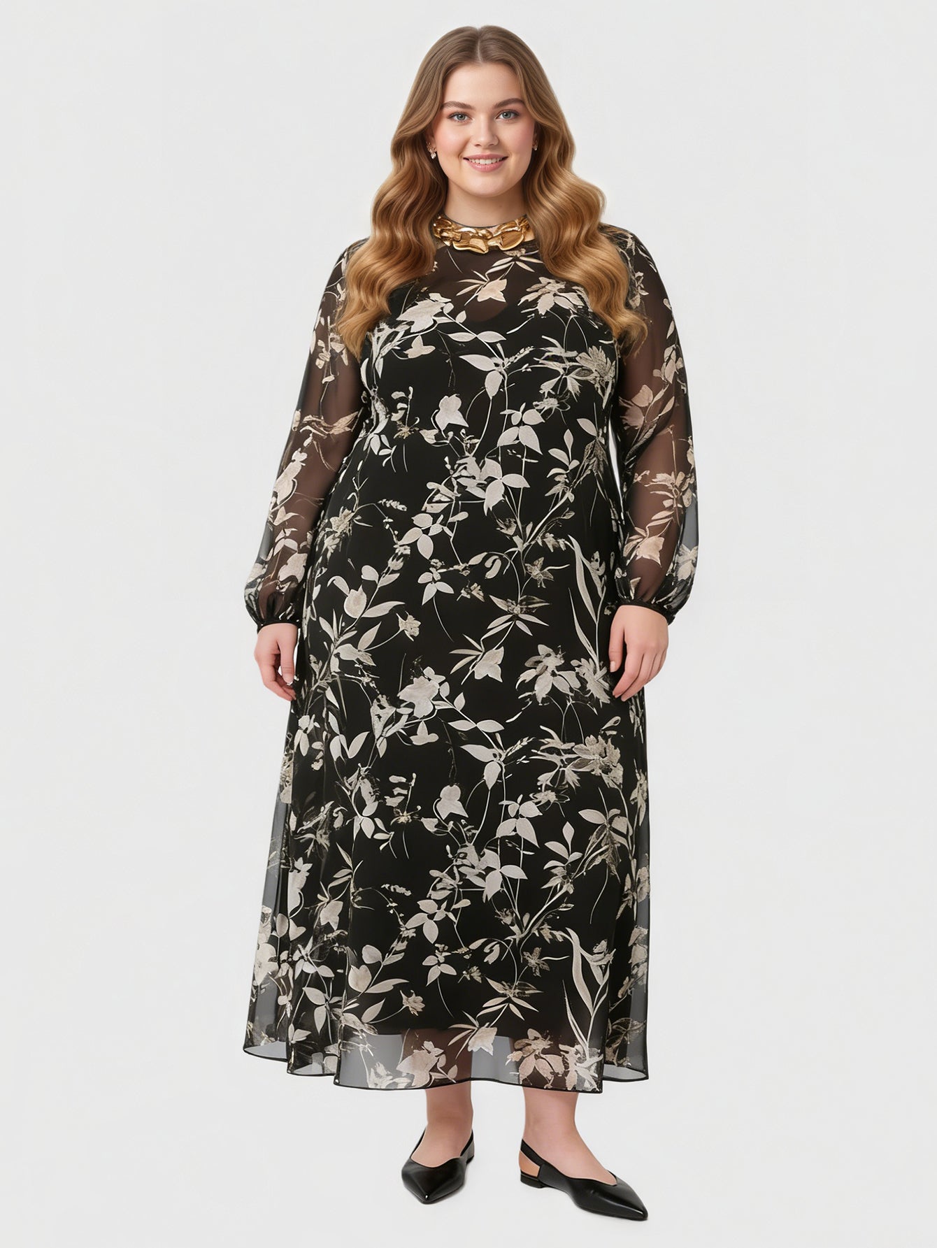 Elevate your vacation style with this plus-size chiffon printed dress. Crafted from lightweight chiffon, this dress offers a flattering, flowy fit with long sleeves and a round neckline.