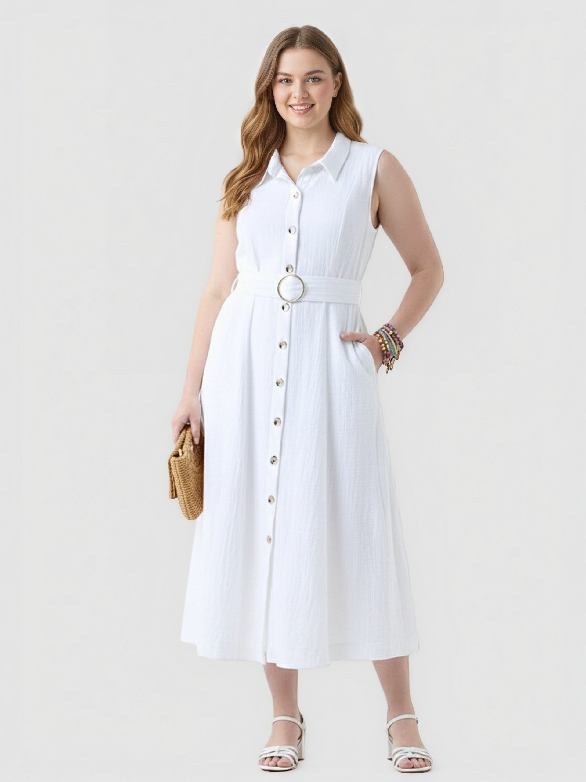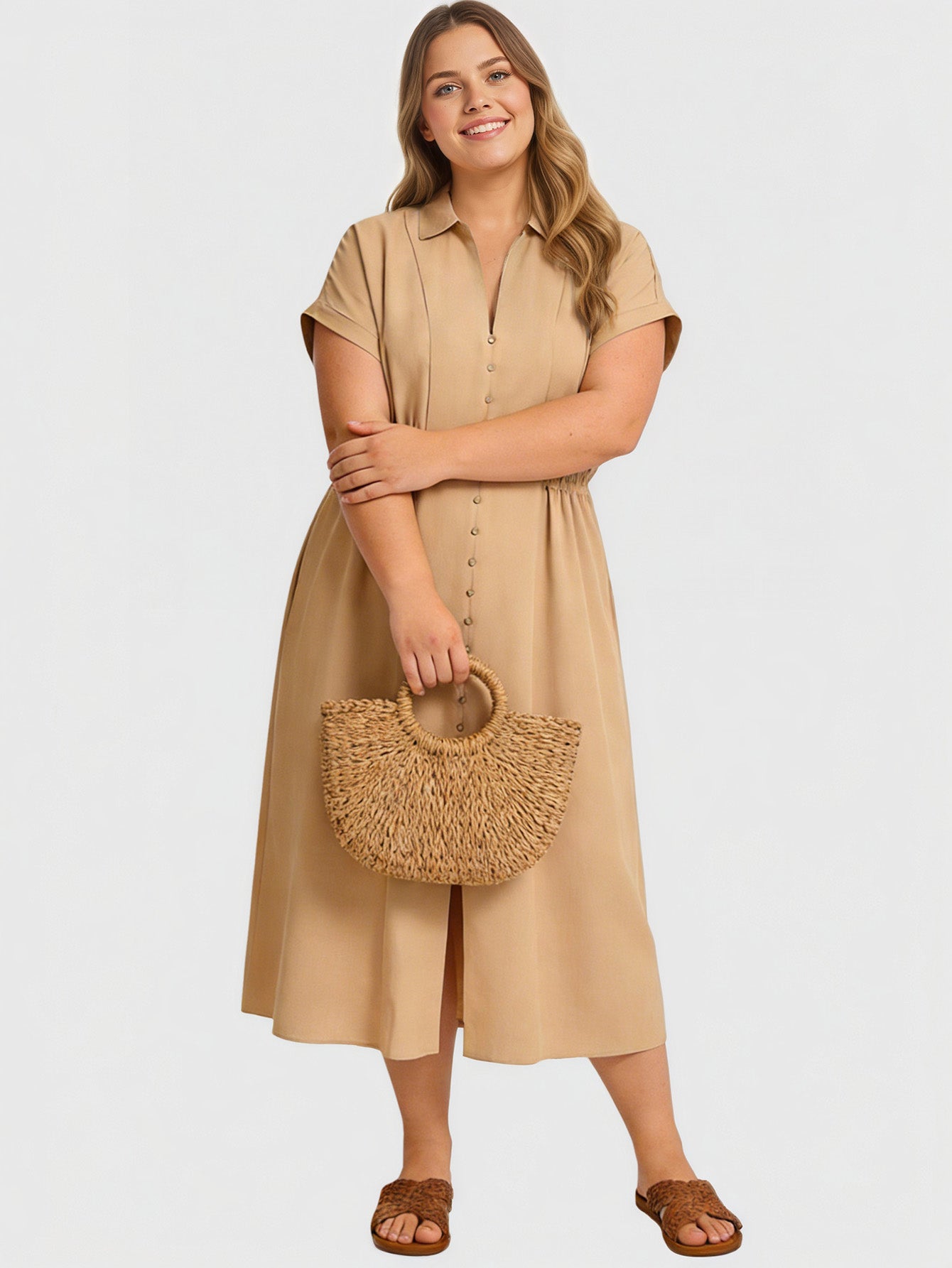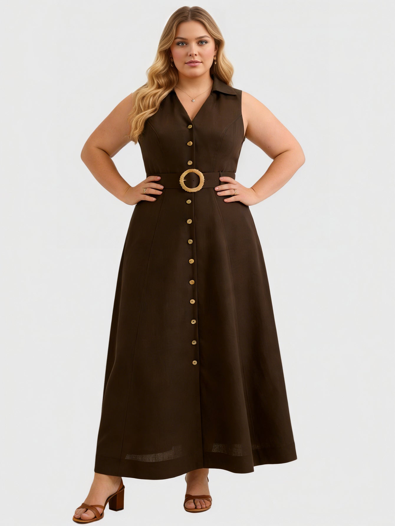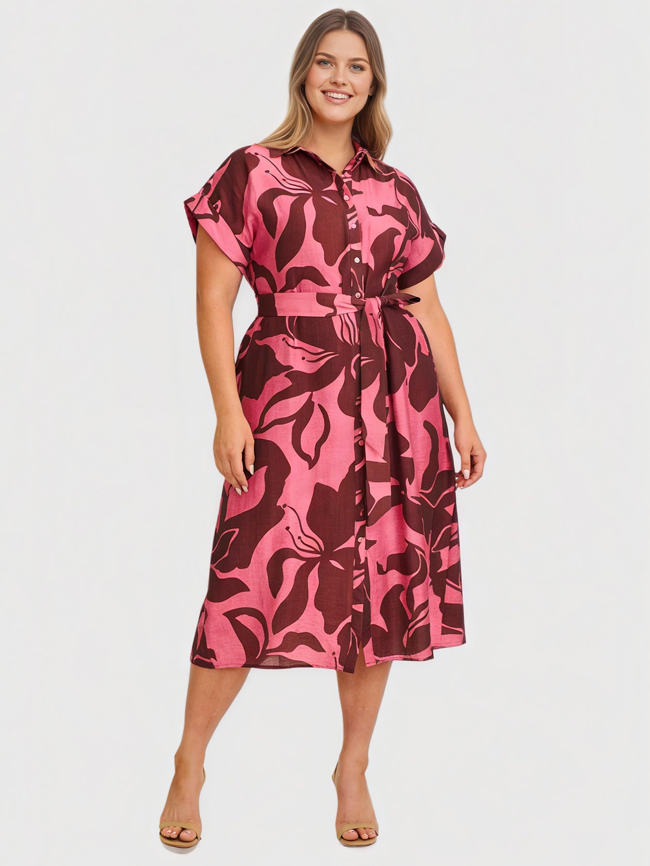 Yeese Plus Size Women's Daily Button Front Dress with Waist Belt