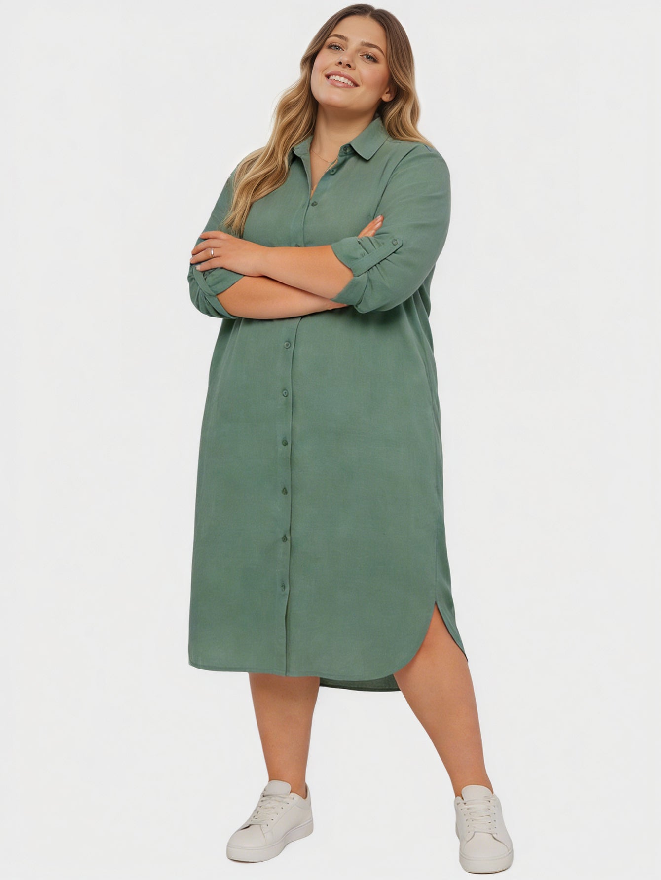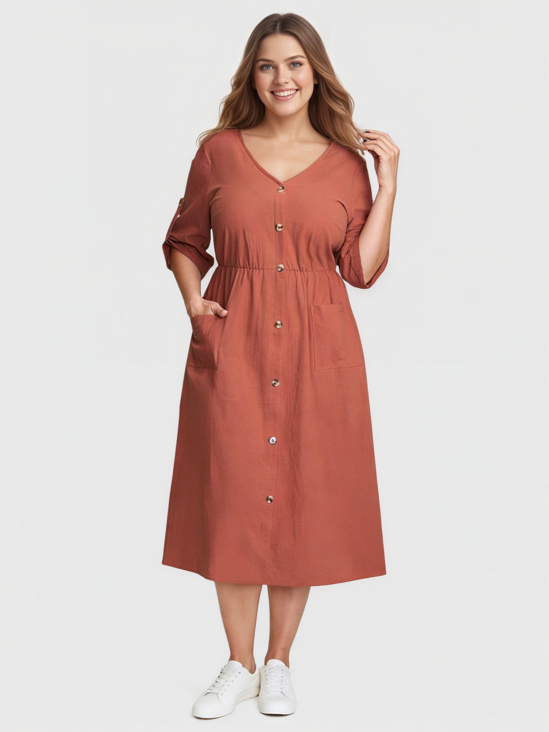 Yeese Plus Size Women's V-Neck Button Pocket Roll Sleeve Casual Dress