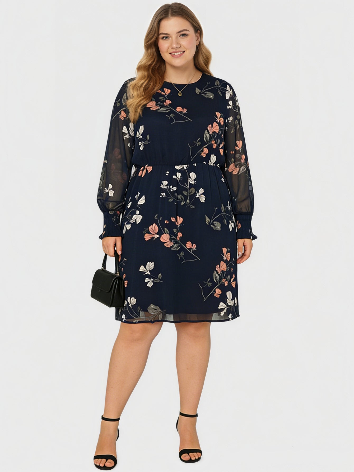 Yeese Plus Size Women's Chiffon Print Long Sleeve Dress
