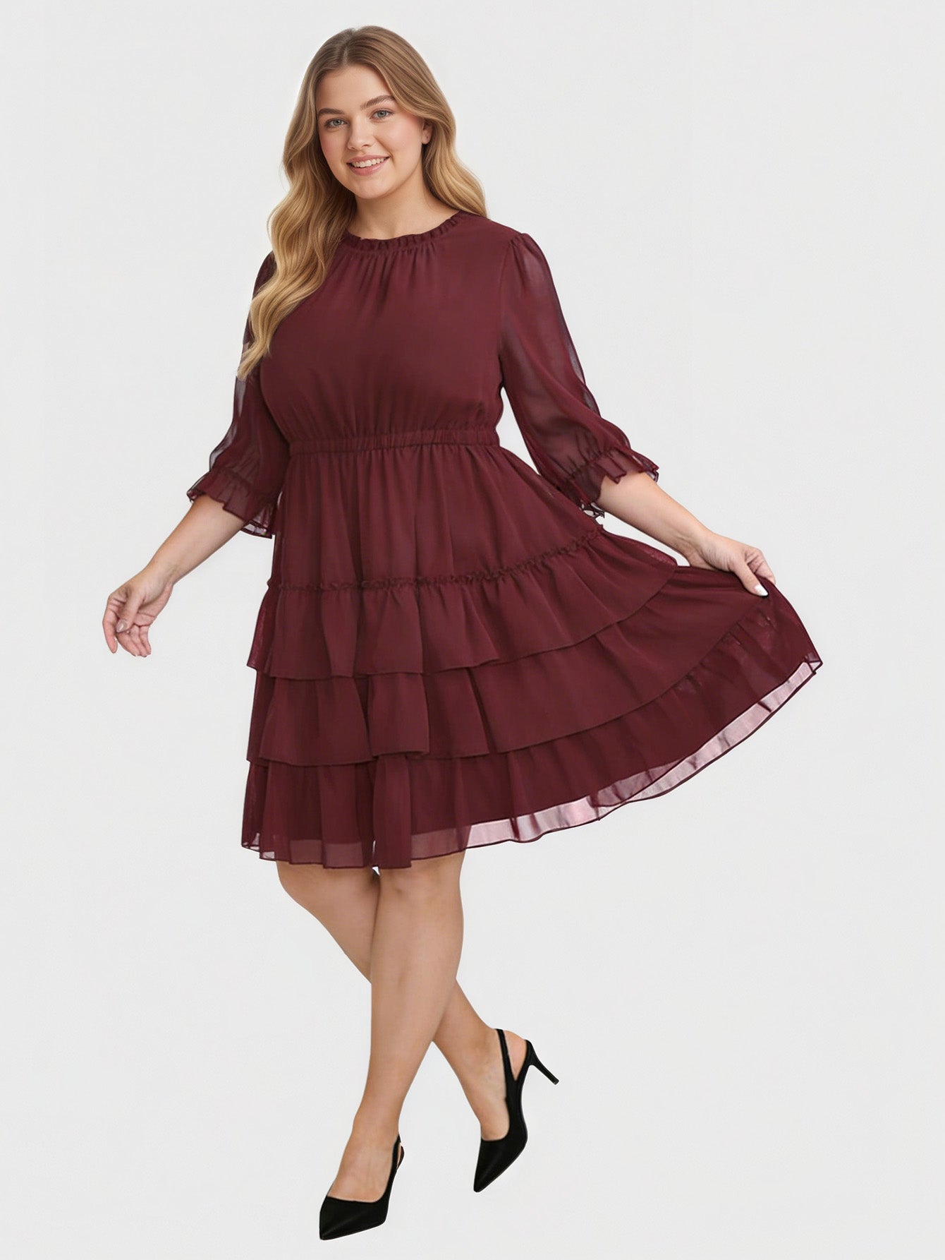 Yeese Plus Size Women's Chiffon Multi-Layer Ruffle 3/4 Sleeve Knee Dress