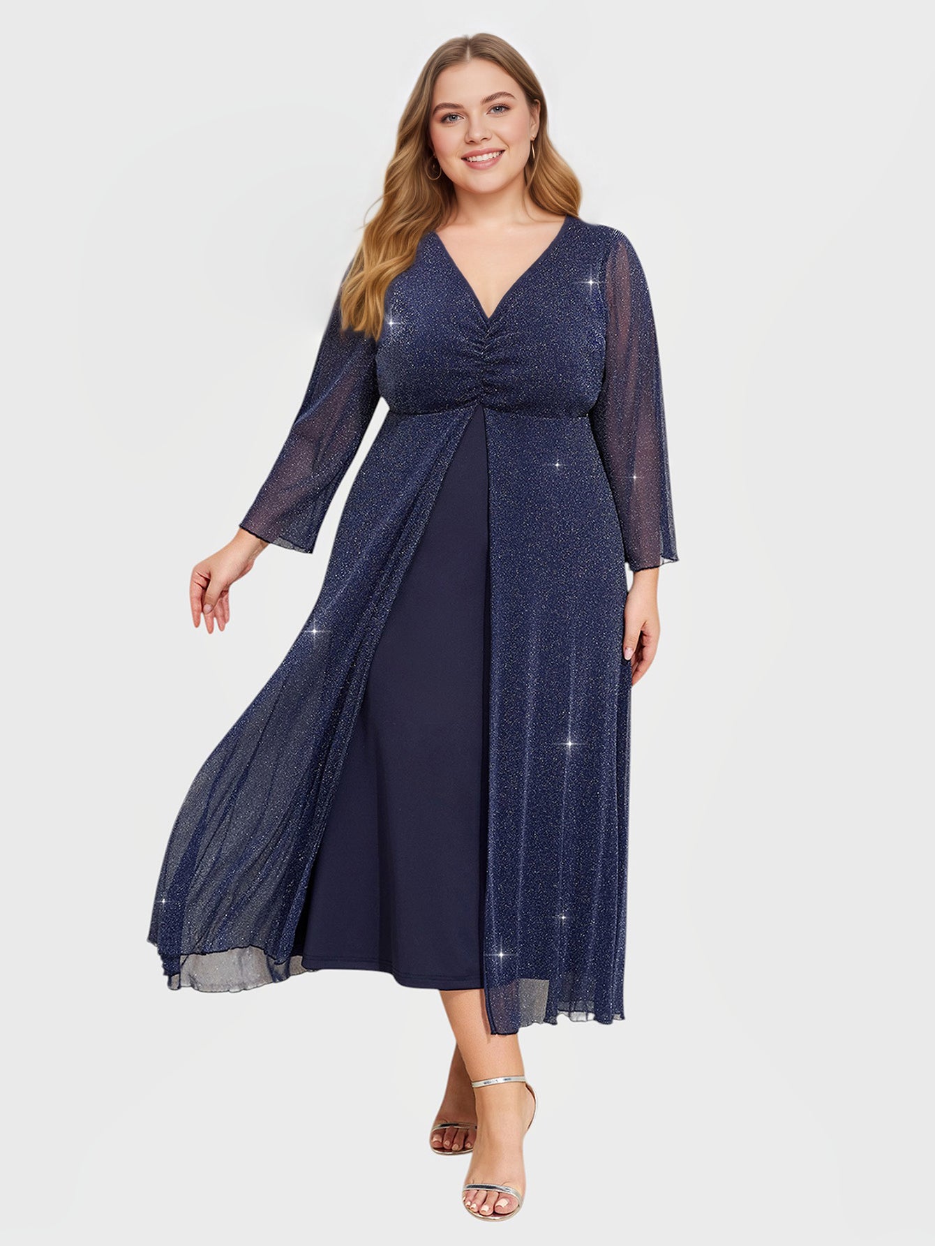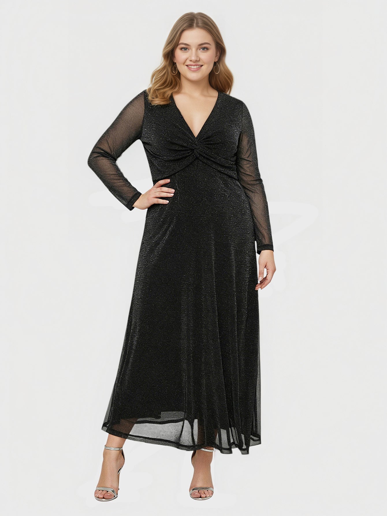 Yeese Wovem's Plus Size Silver Mesh Ruched Elegant Long Sleeve Fashion Commuter Dress