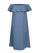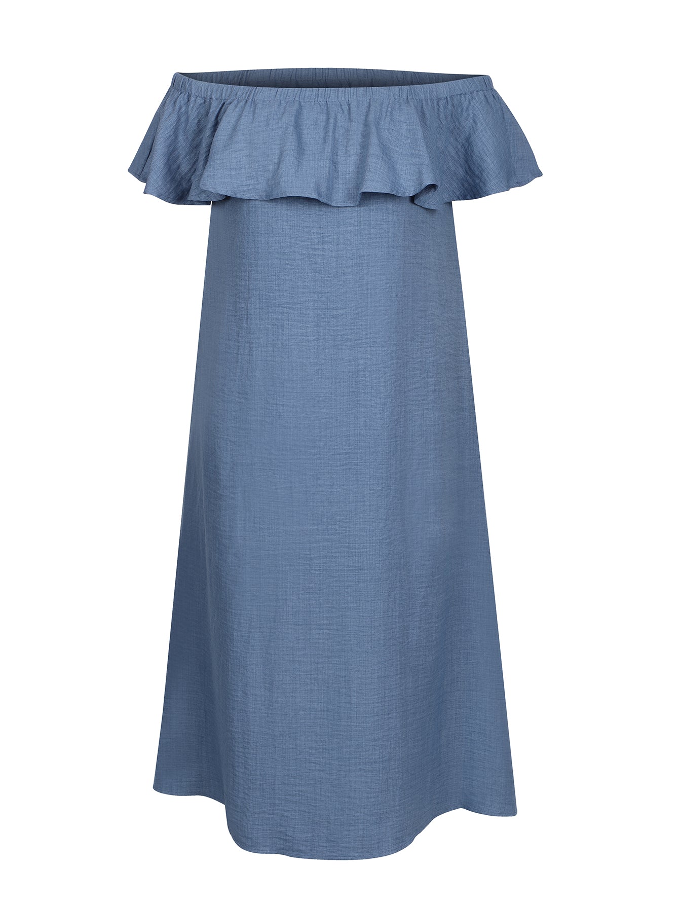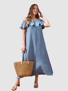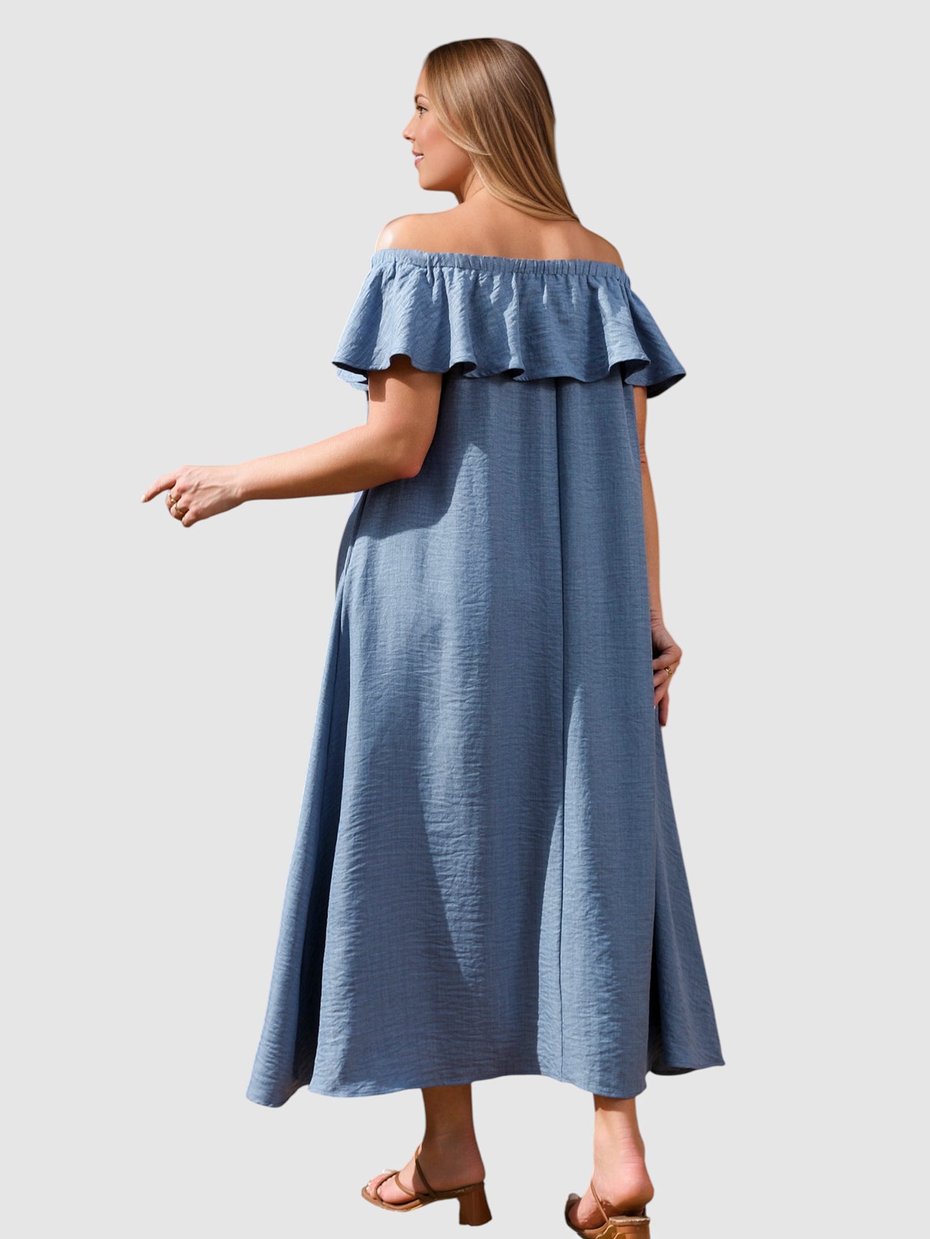 An off-shoulder neckline and soft ruffle accents add a romantic touch, while short sleeves and side pockets bring relaxed, practical charm.