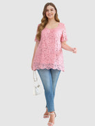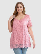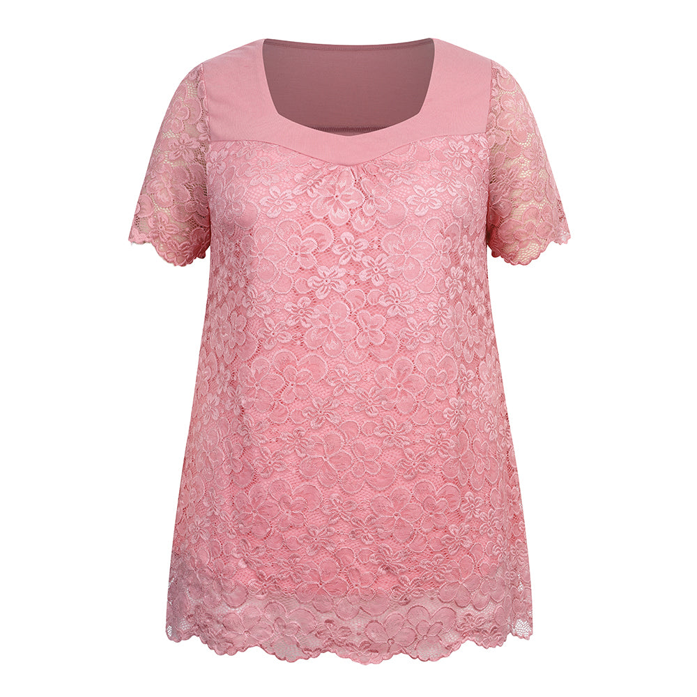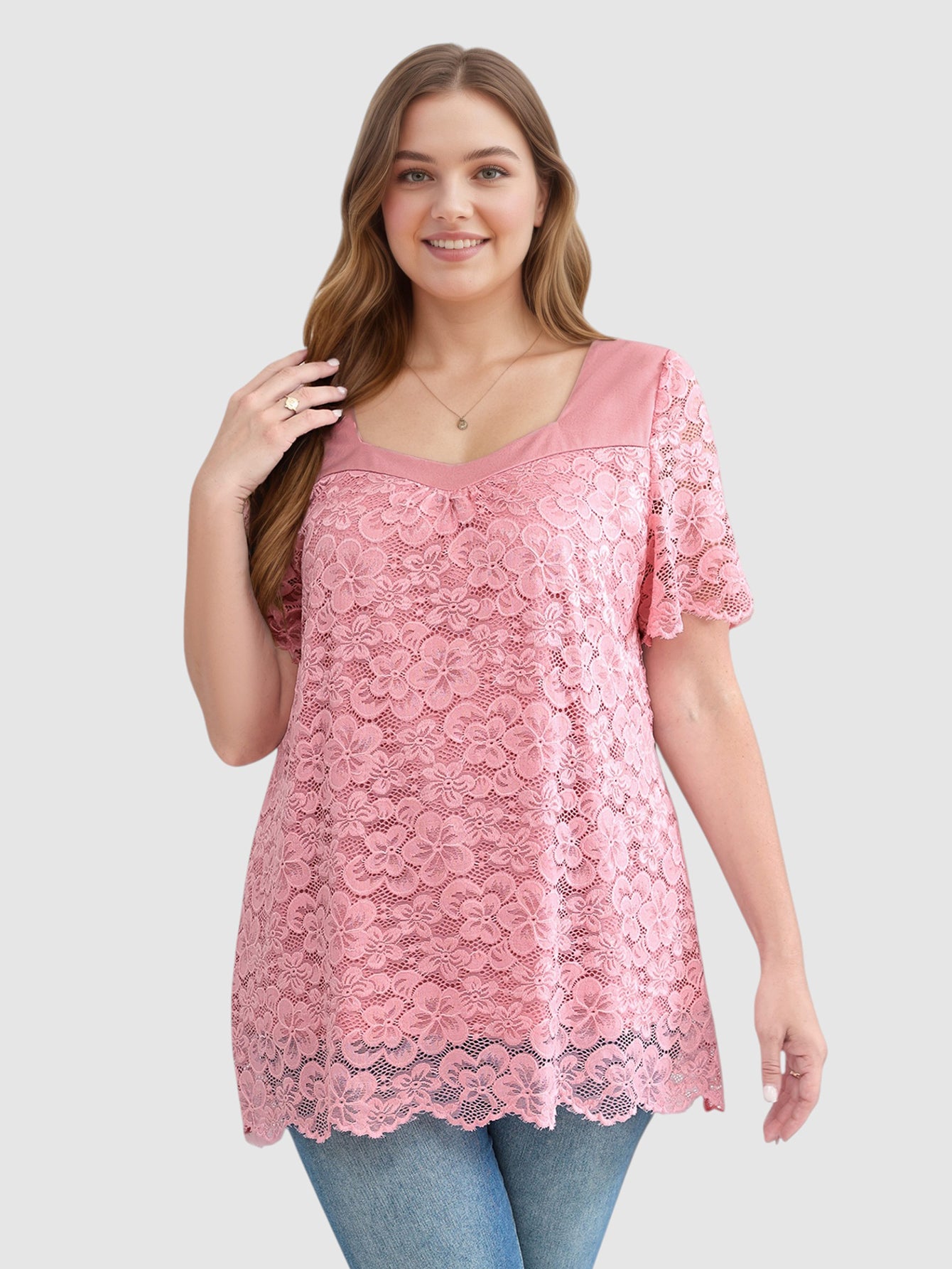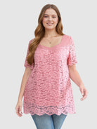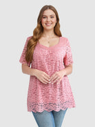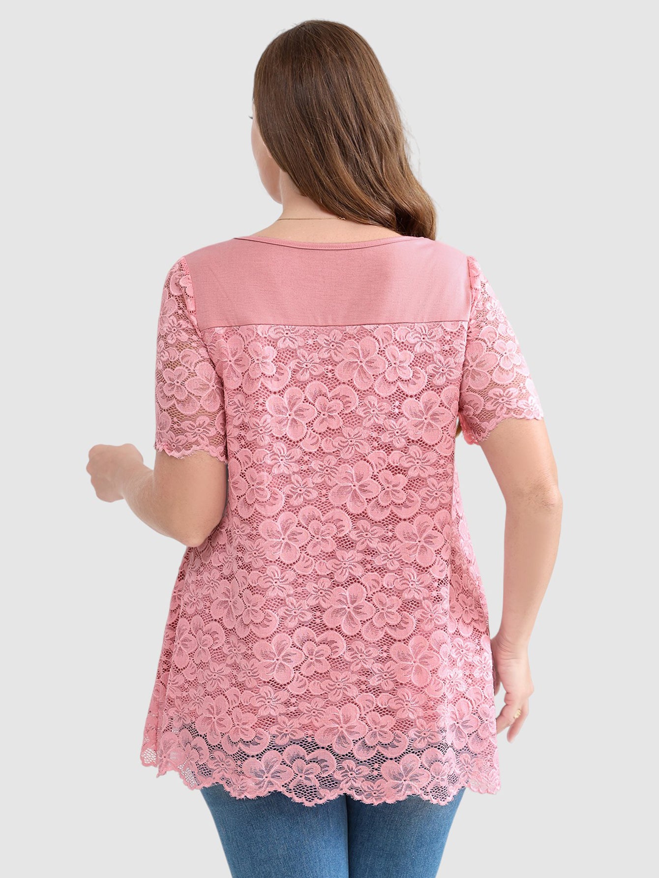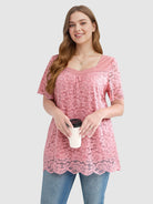 Yeese Women's Plus Size Solid Lace Patchwork Elegant Short Sleeve Top