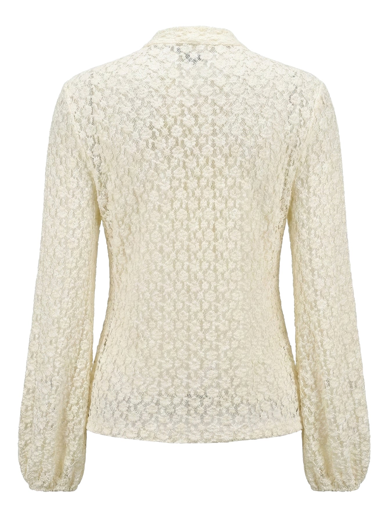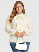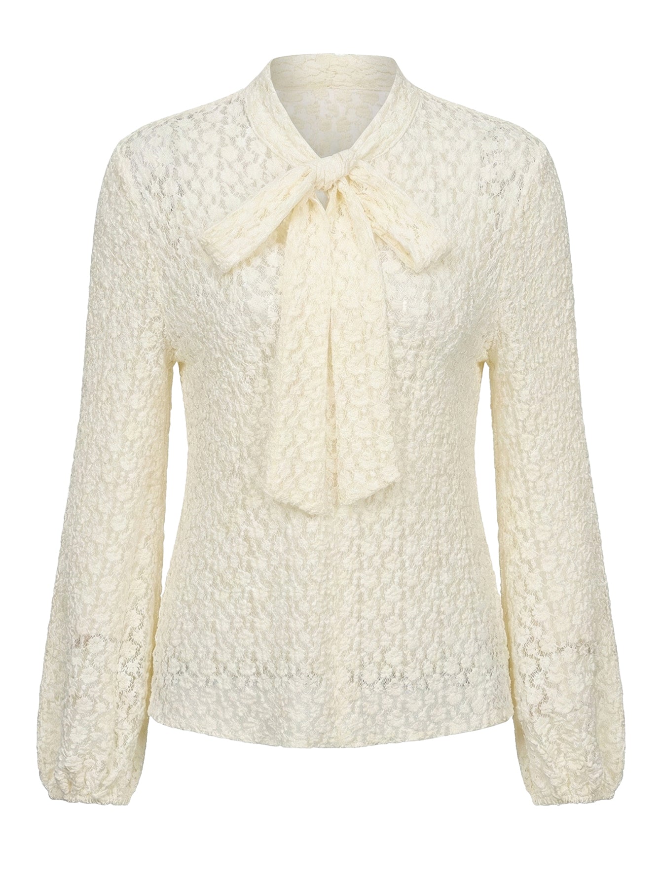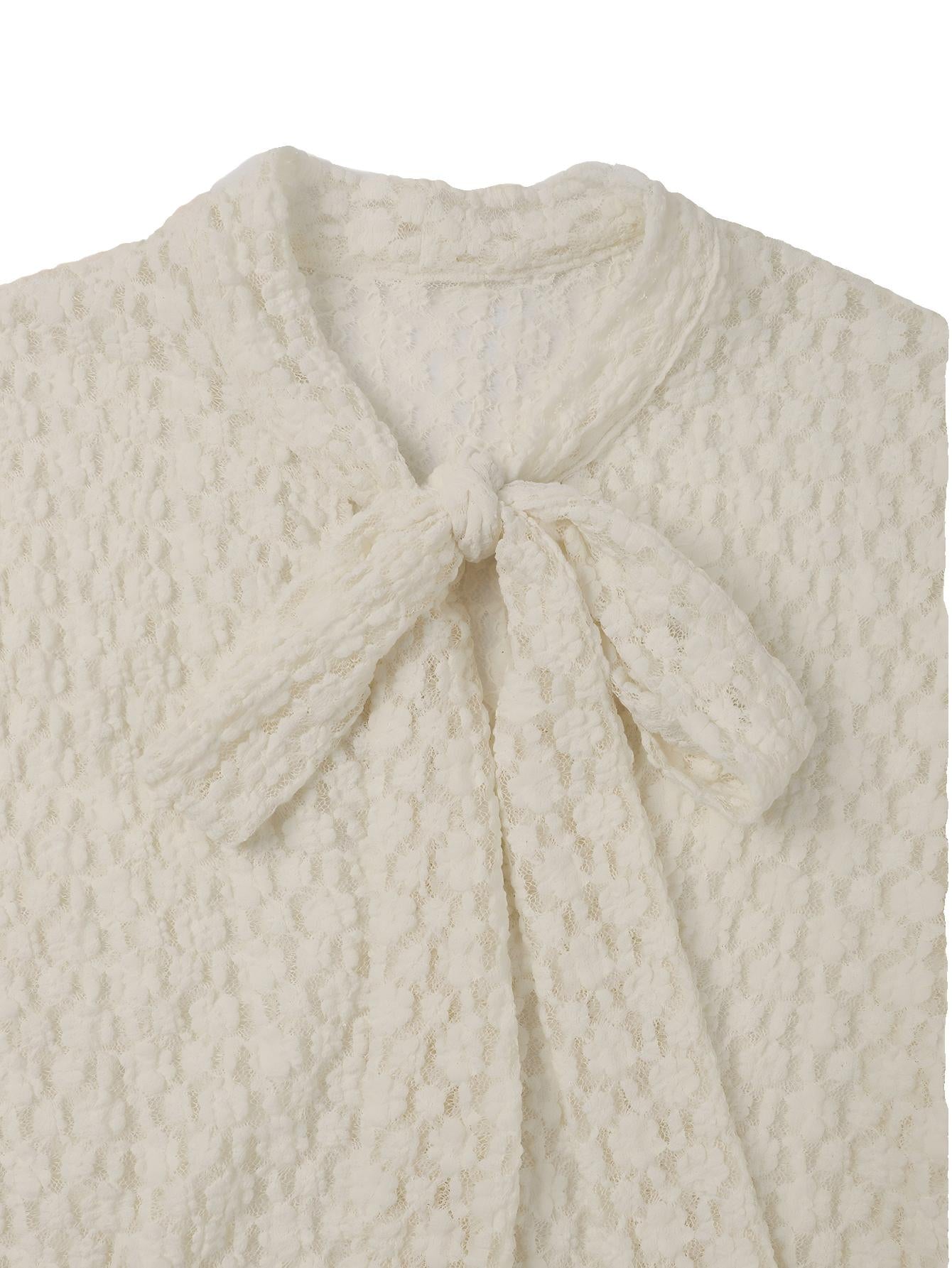 An elegant long-sleeve top with delicate lace accents and a bow collar, perfect for both formal and casual wear.