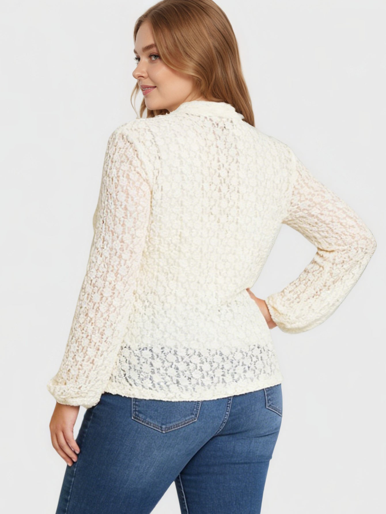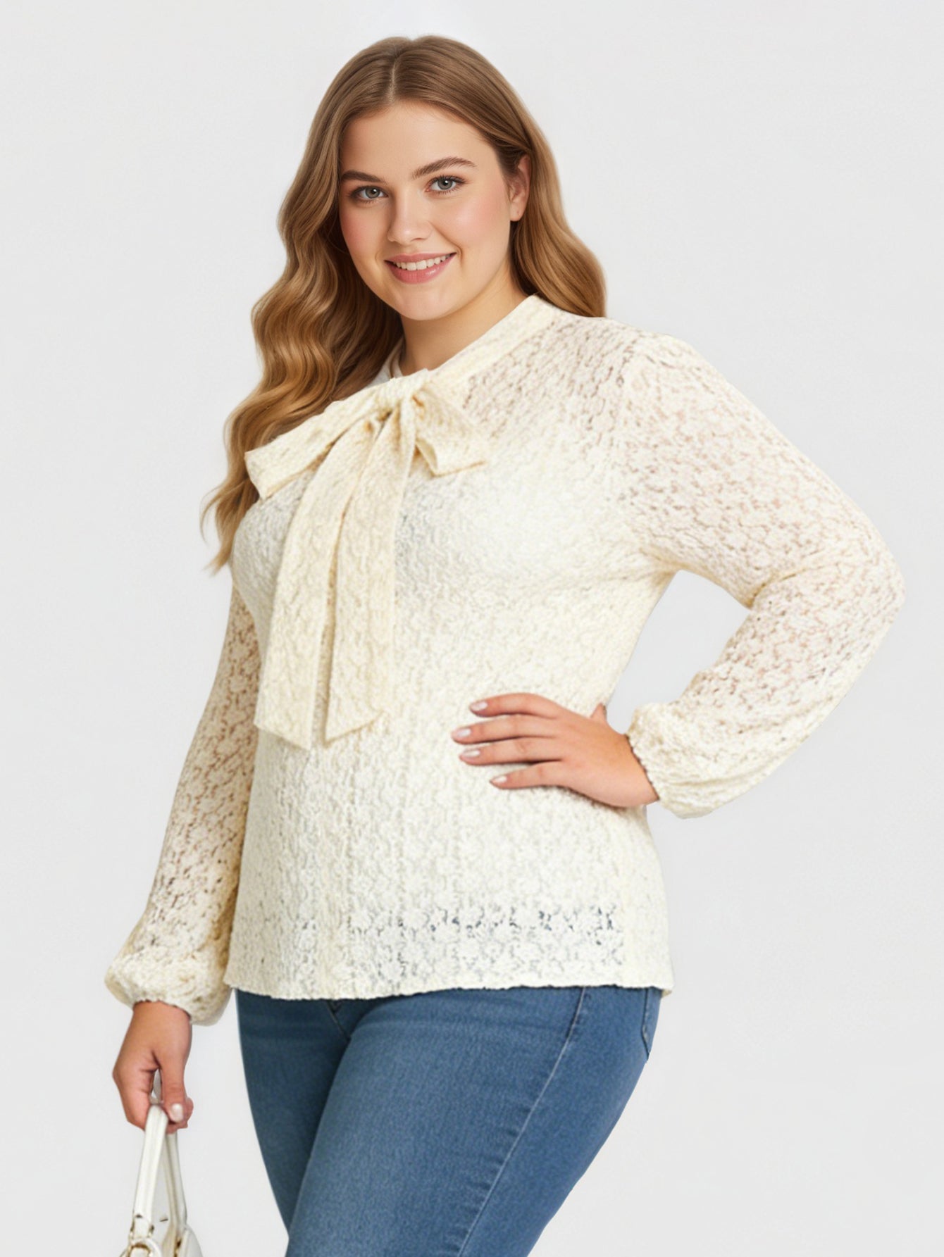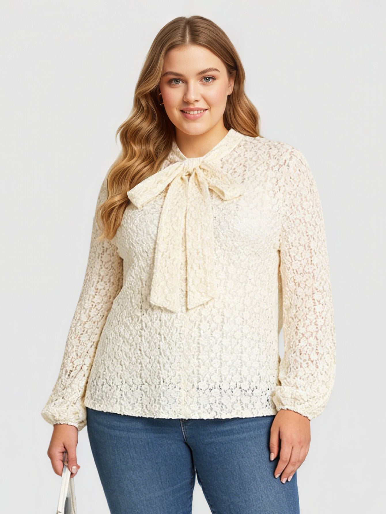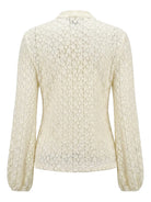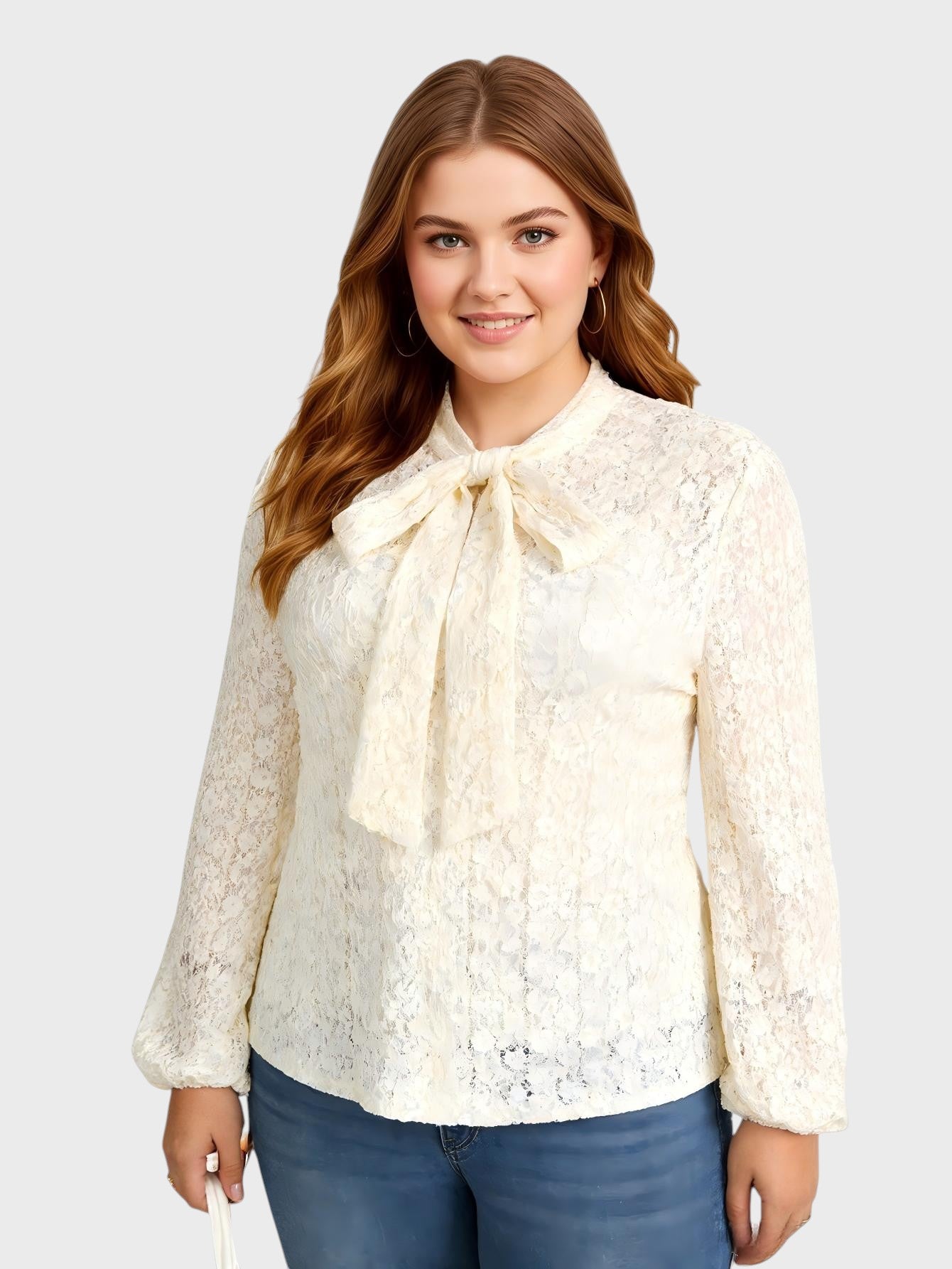 An elegant long-sleeve top with delicate lace accents and a bow collar, perfect for both formal and casual wear.
