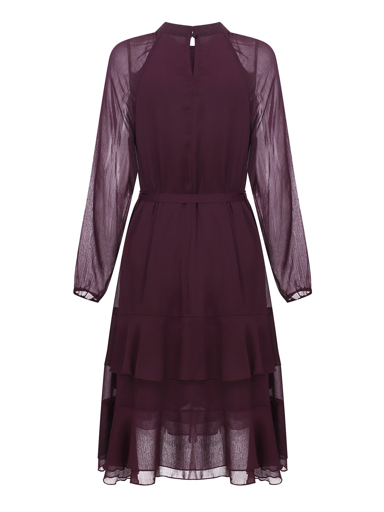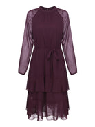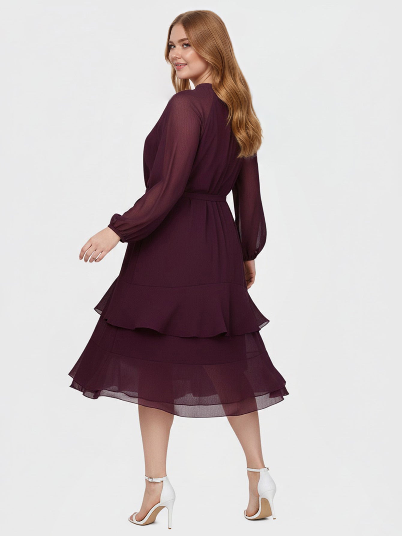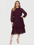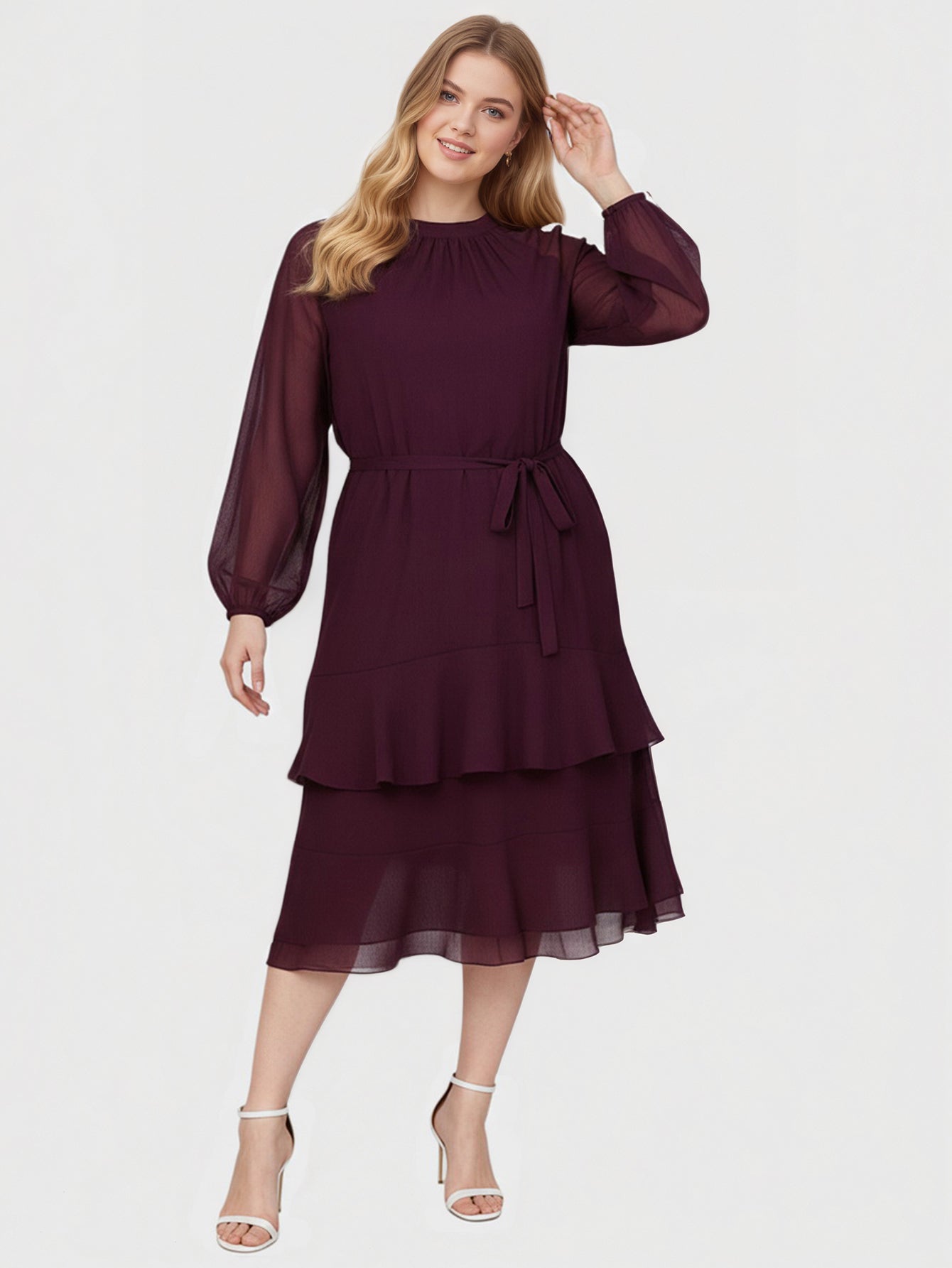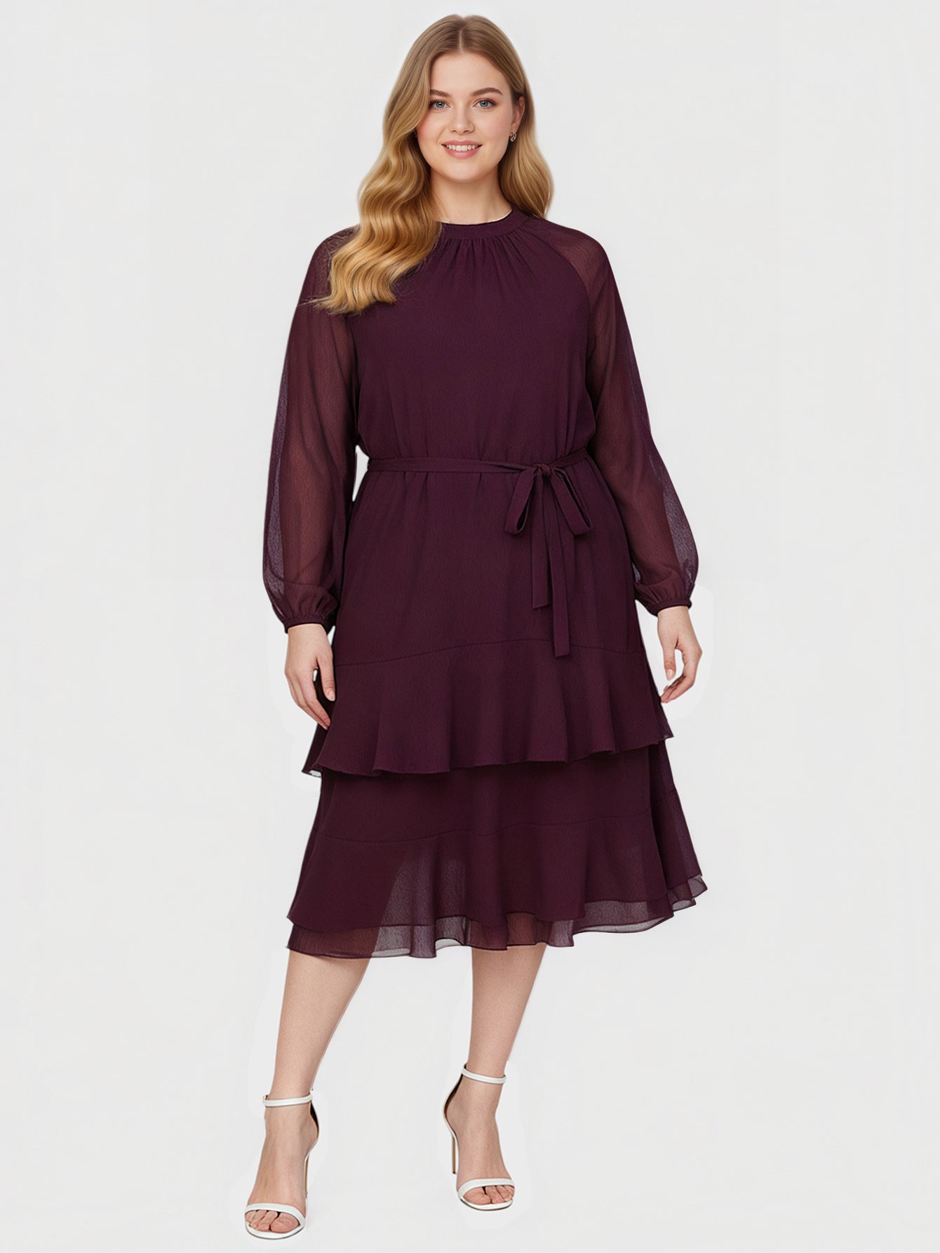Yeese Women's Plus Size Solid Chiffon Ruffled Elegant Long Sleeve Dress With Belt