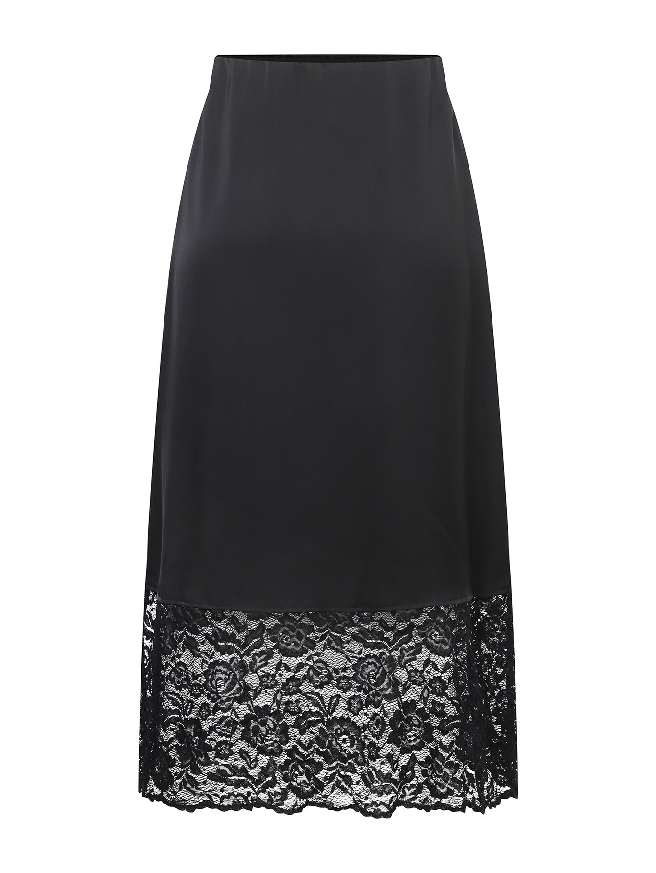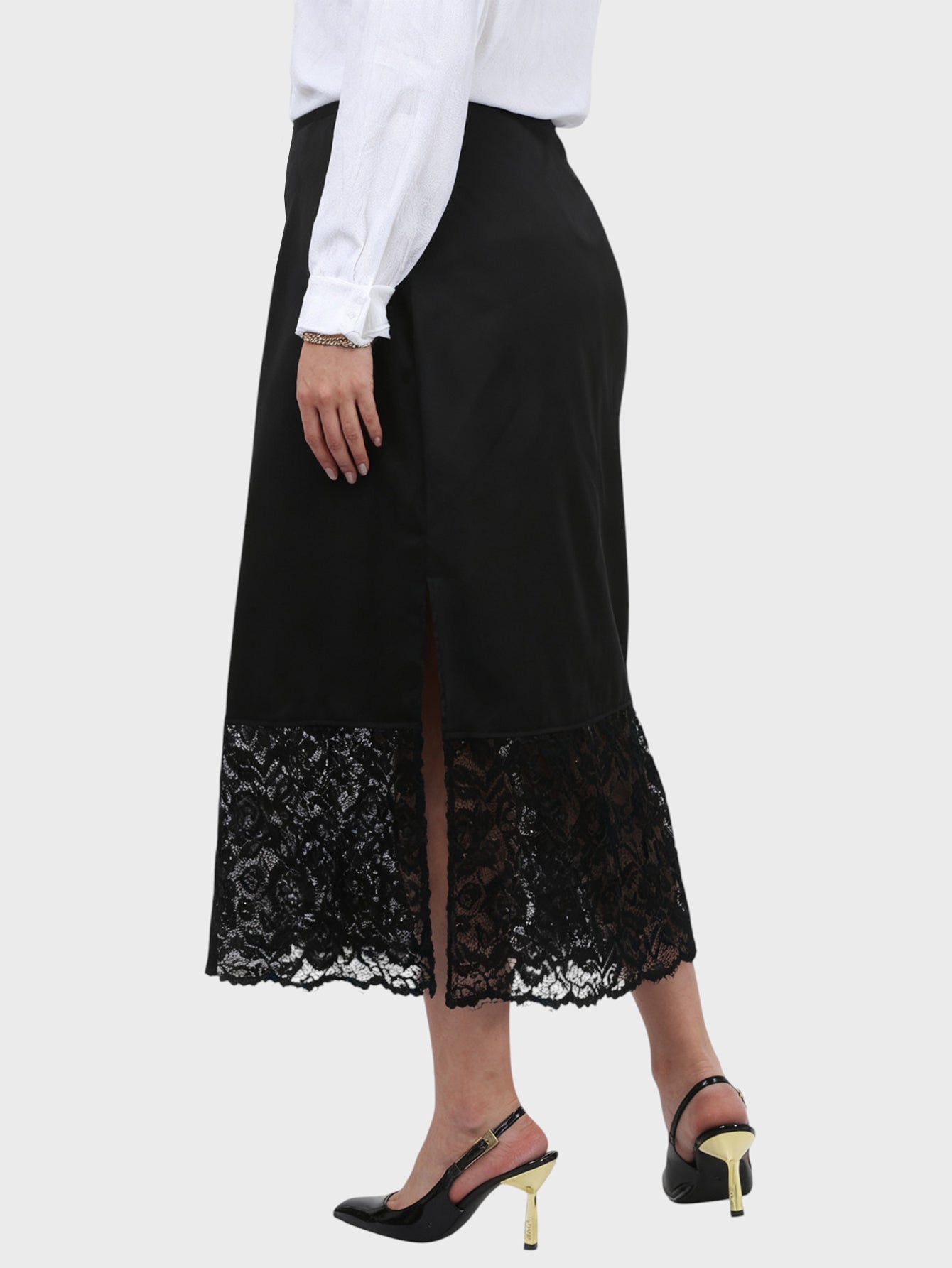 The solid color enhances the contrast of satin, lace, and sequins, pairing effortlessly with metallic accessories or classic neutrals for a refined finish.