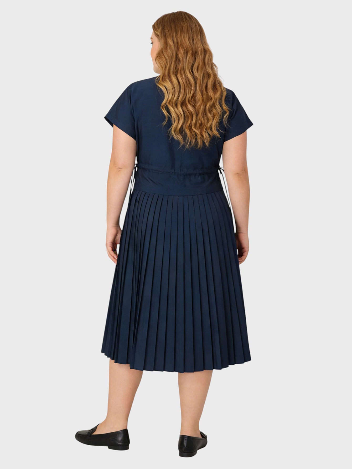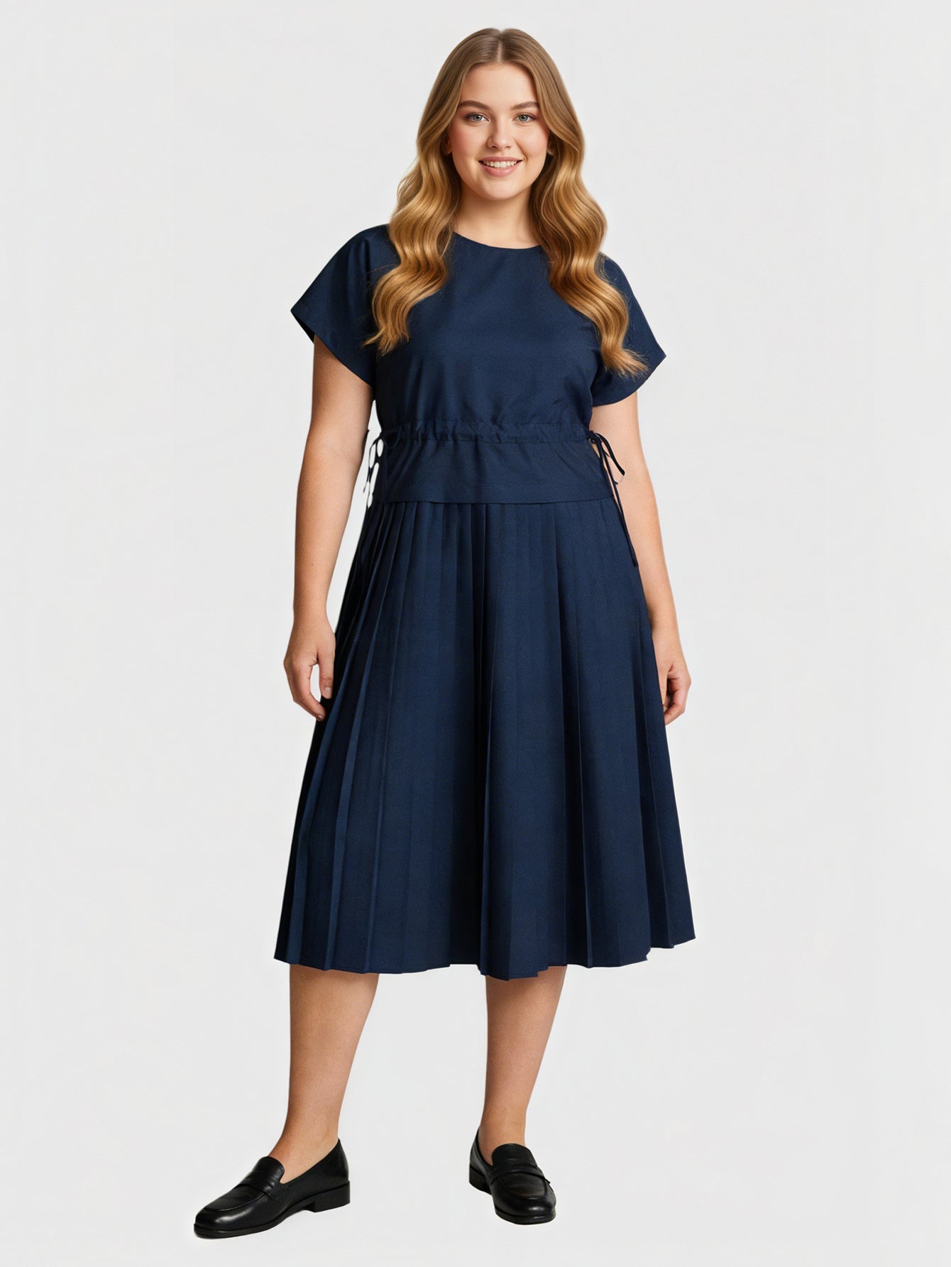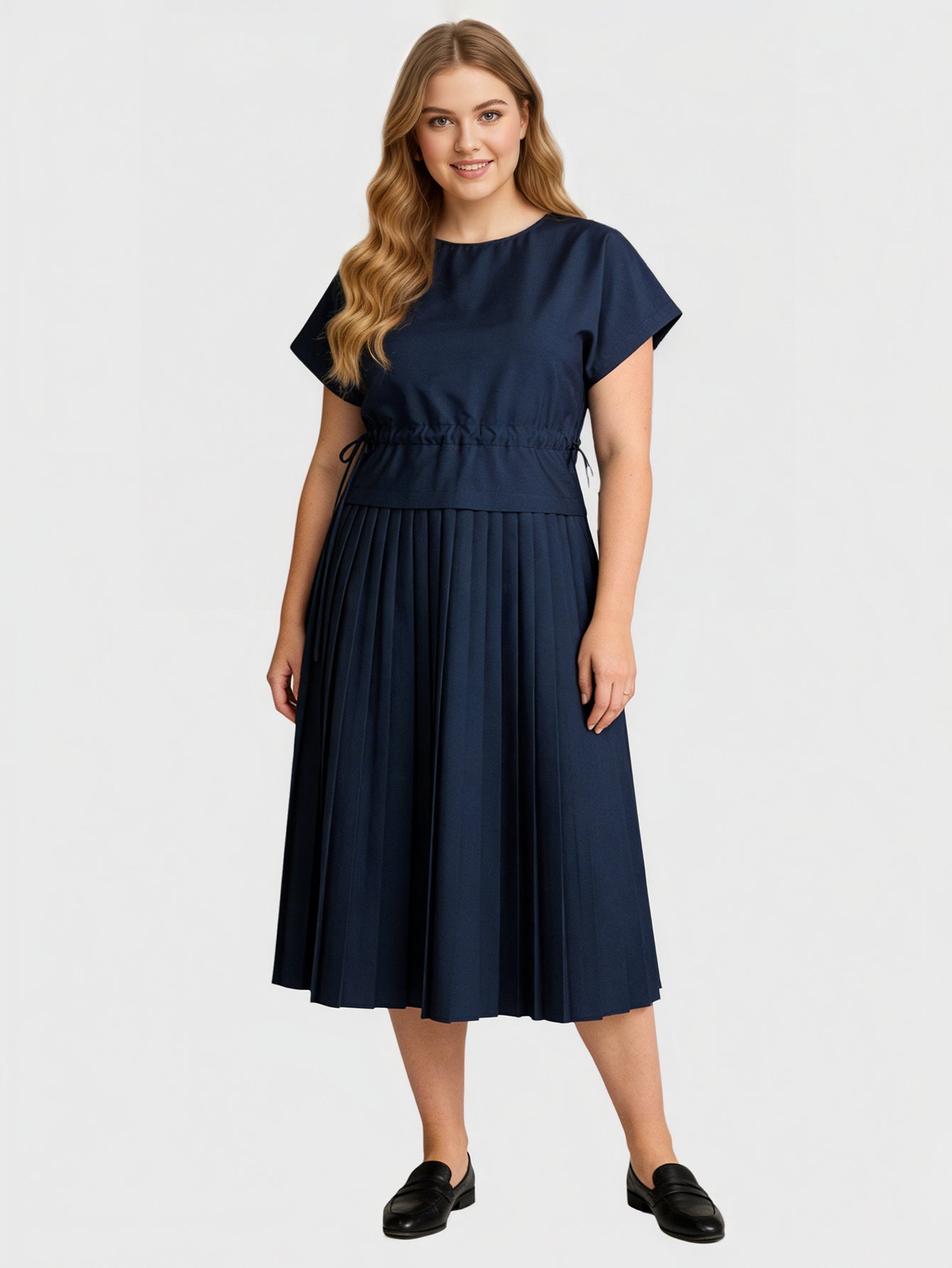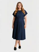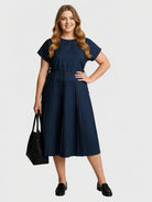 This Yeese Plus Size Drawstring Pleated Dress offers a flattering fit with its adjustable waist, soft pleats, and relaxed midi silhouette. Made from breathable cotton, it combines comfort with sophistication, perfect for any occasion.
