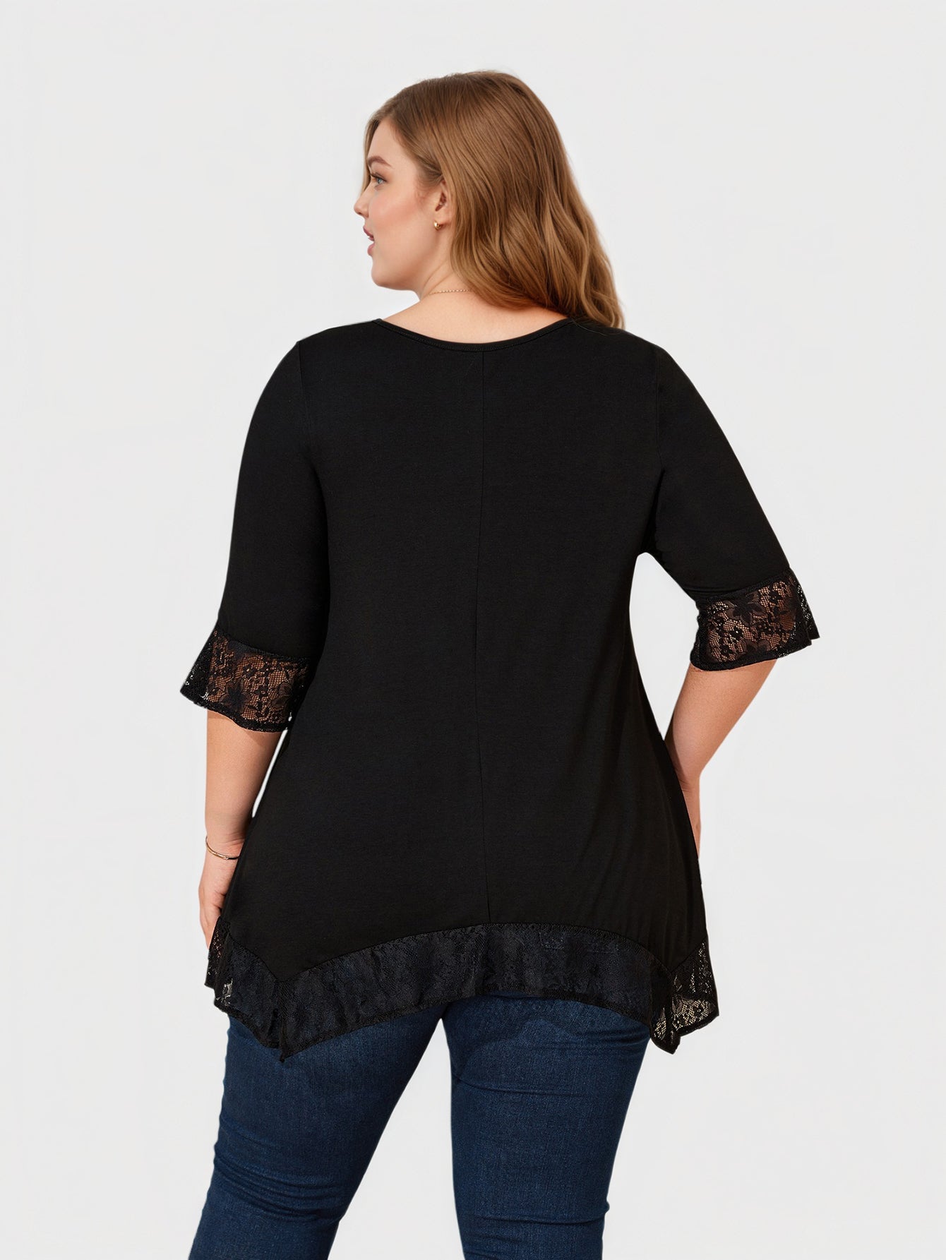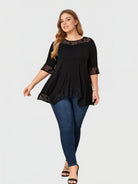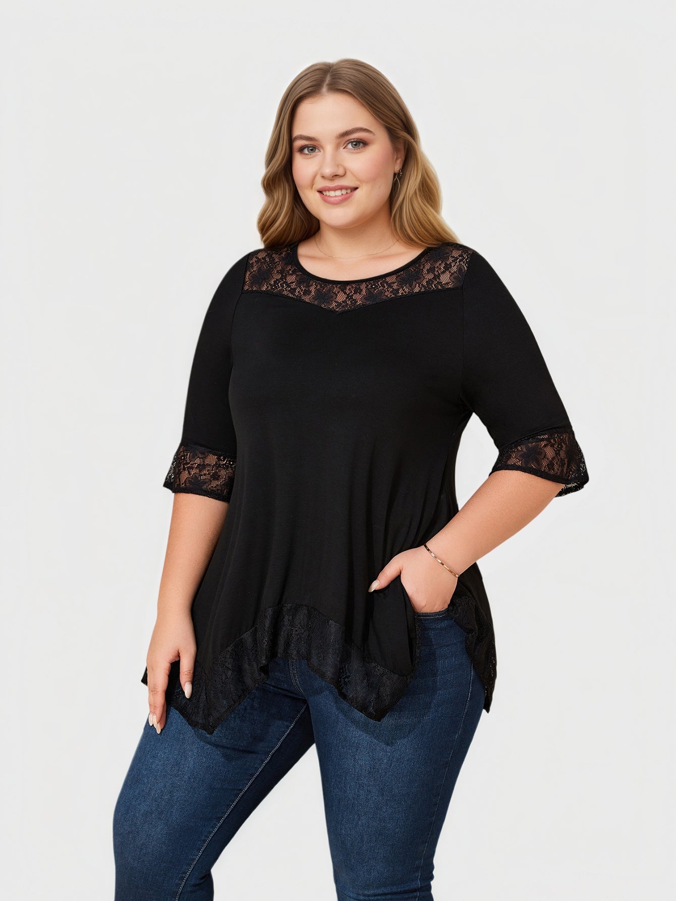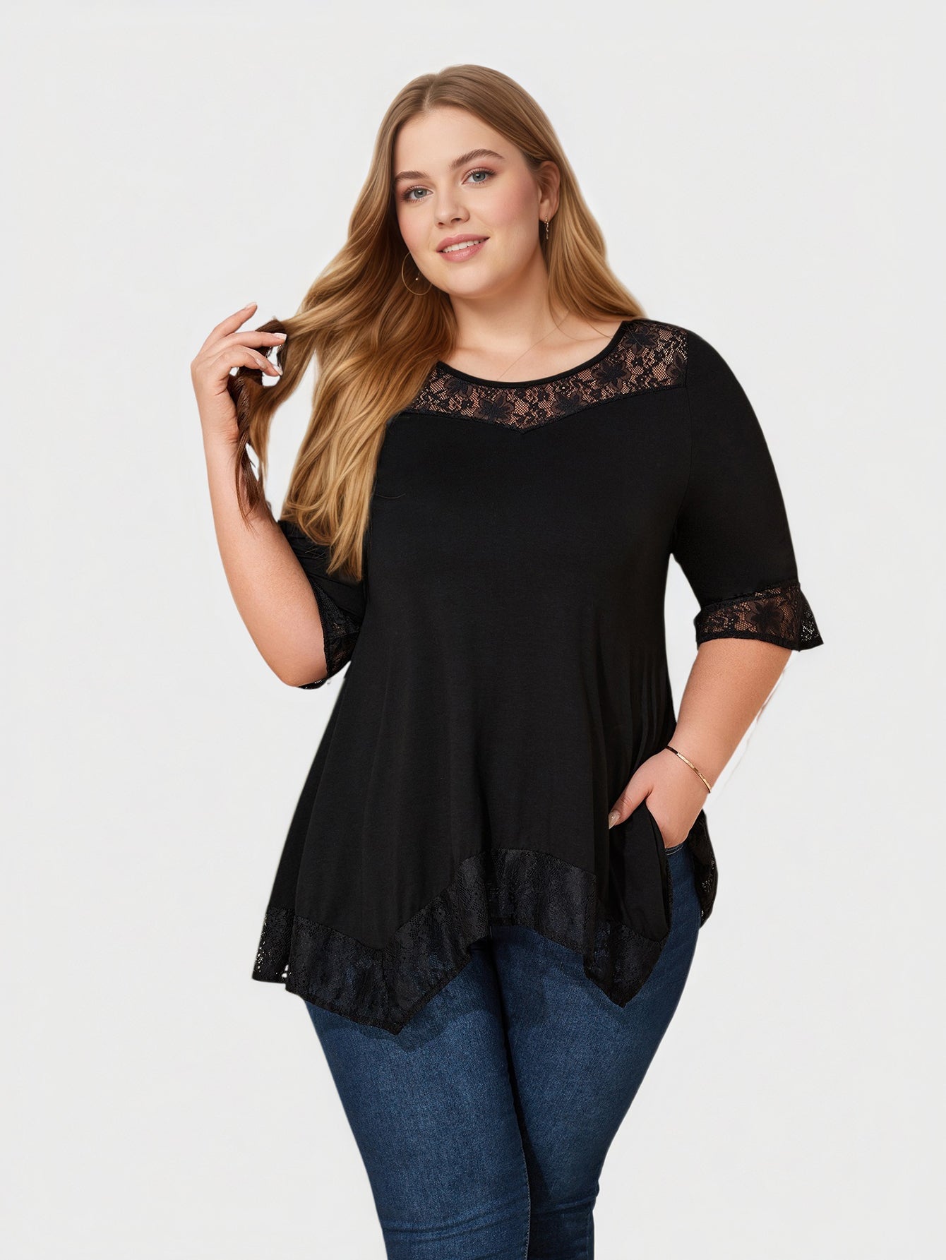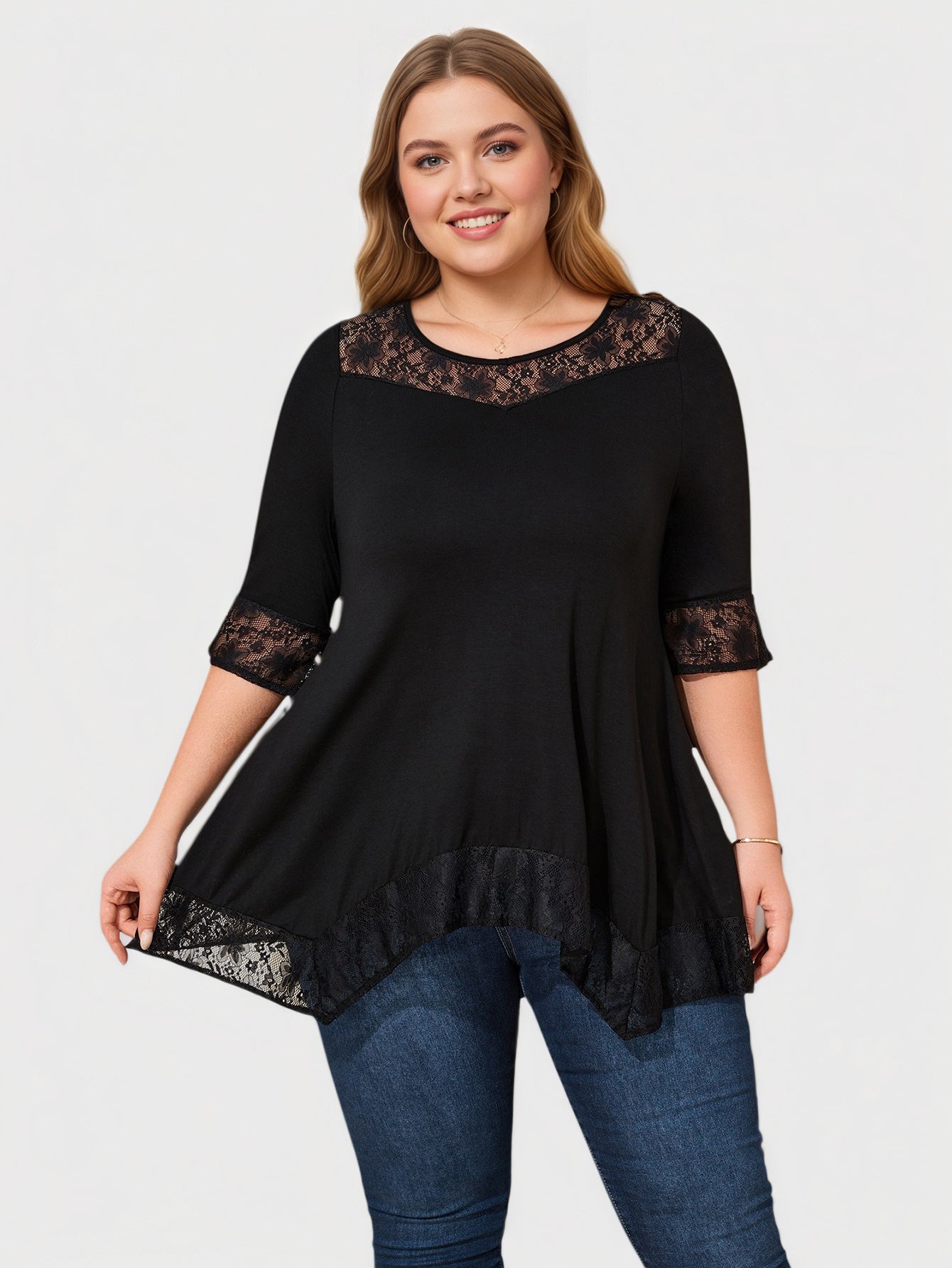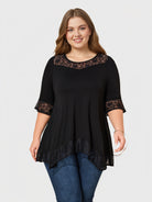 Ein elegantes Plus-Size-Top, das zarte Spitzeneinsätze mit einem fließenden Haifischbiss-Saum kombiniert und so für anmutige Bewegung und eine raffinierte Silhouette sorgt. Es ist leicht, ausdrucksstark und lässt sich mühelos vom Tag bis zum Abend tragen.