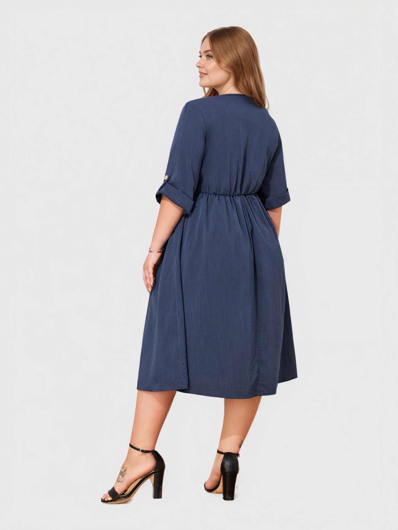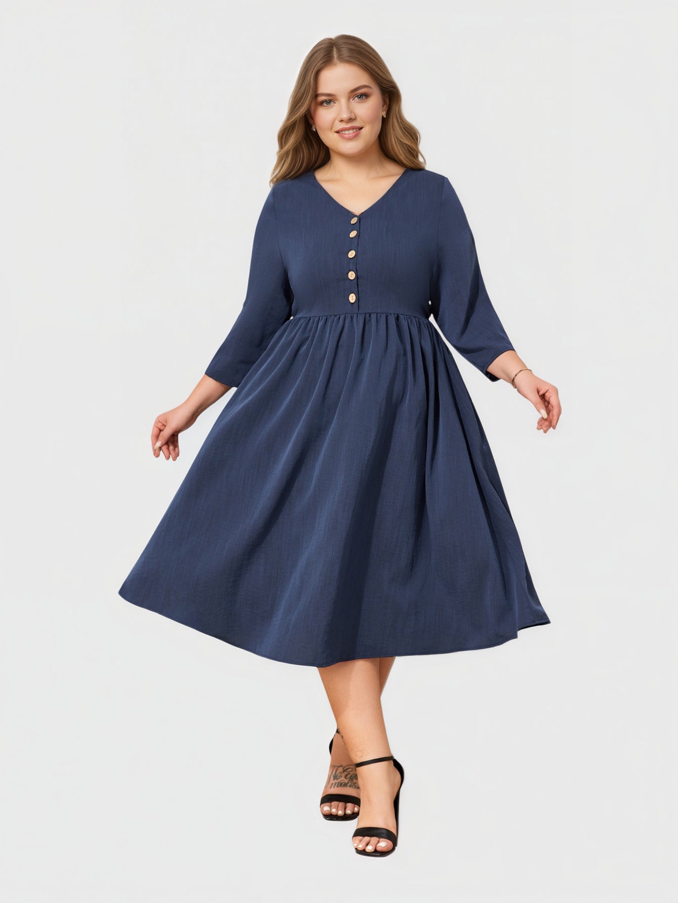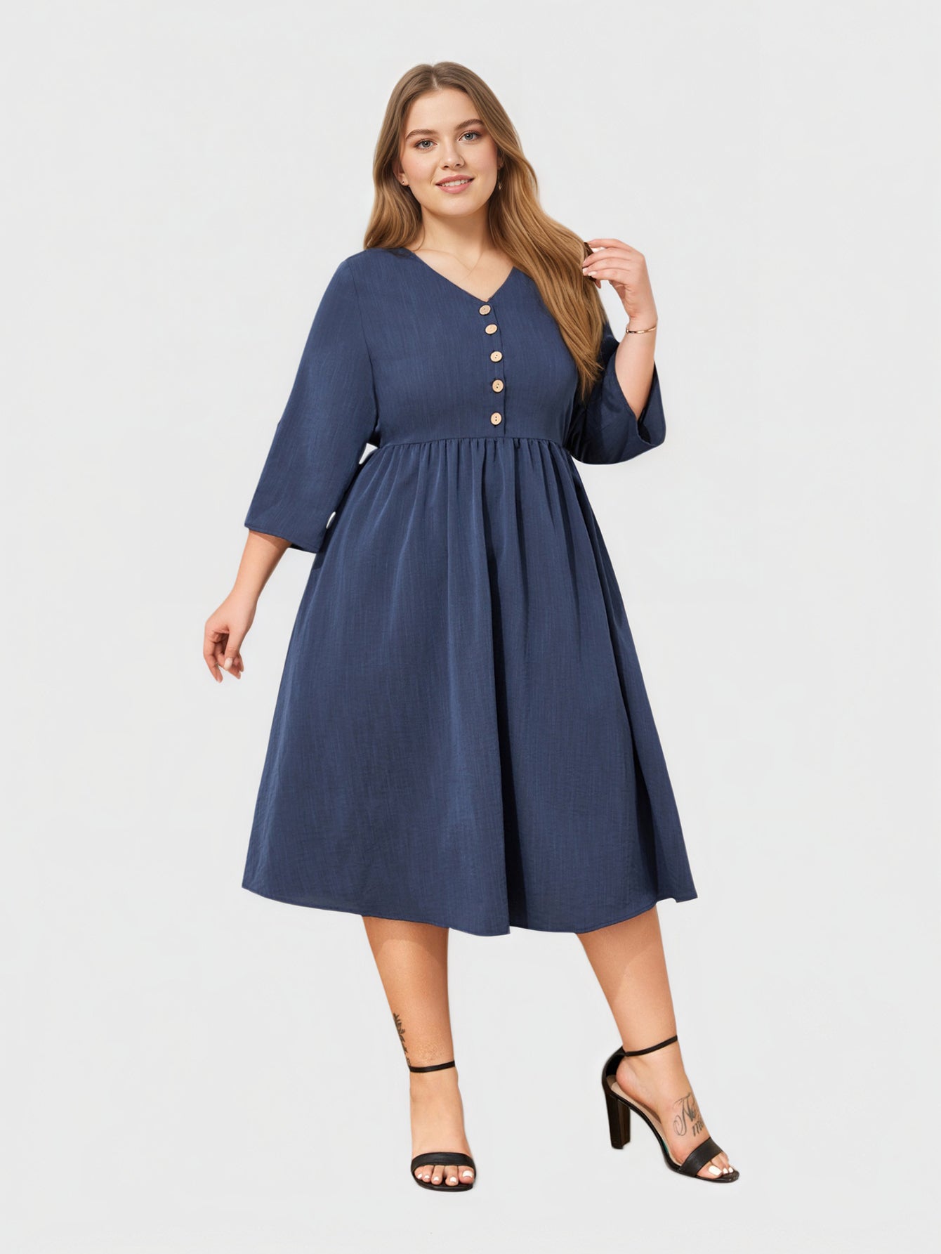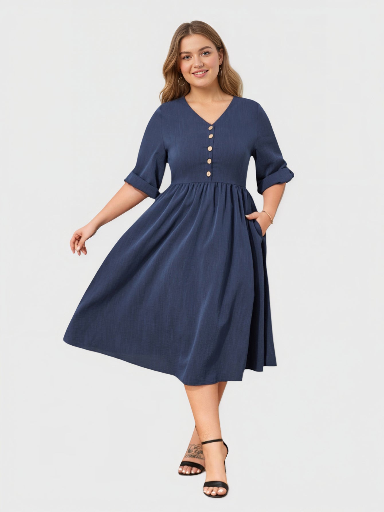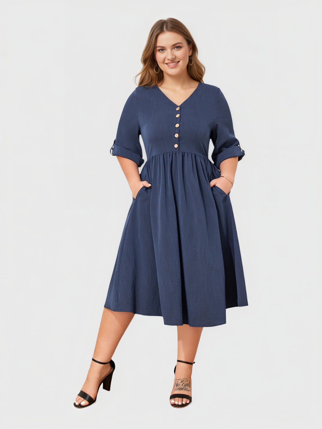 Ein schickes Midikleid, das die Kurven vorteilhaft betont und mit einem V-Ausschnitt, 3/4-Ärmeln und praktischen Taschen für Eleganz im Alltag sorgt.