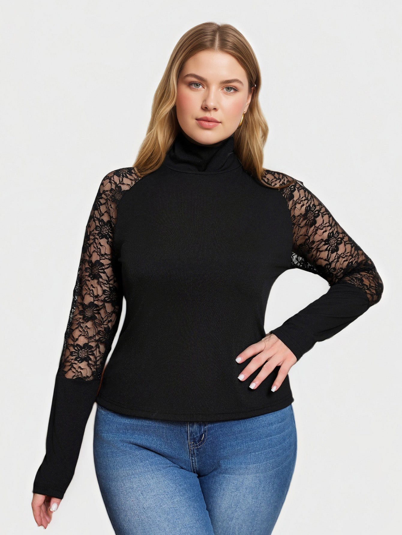 Yeese Plus Size Rippstrick-Top mit Spitzenbesatz, vielseitig, mit Rollkragen