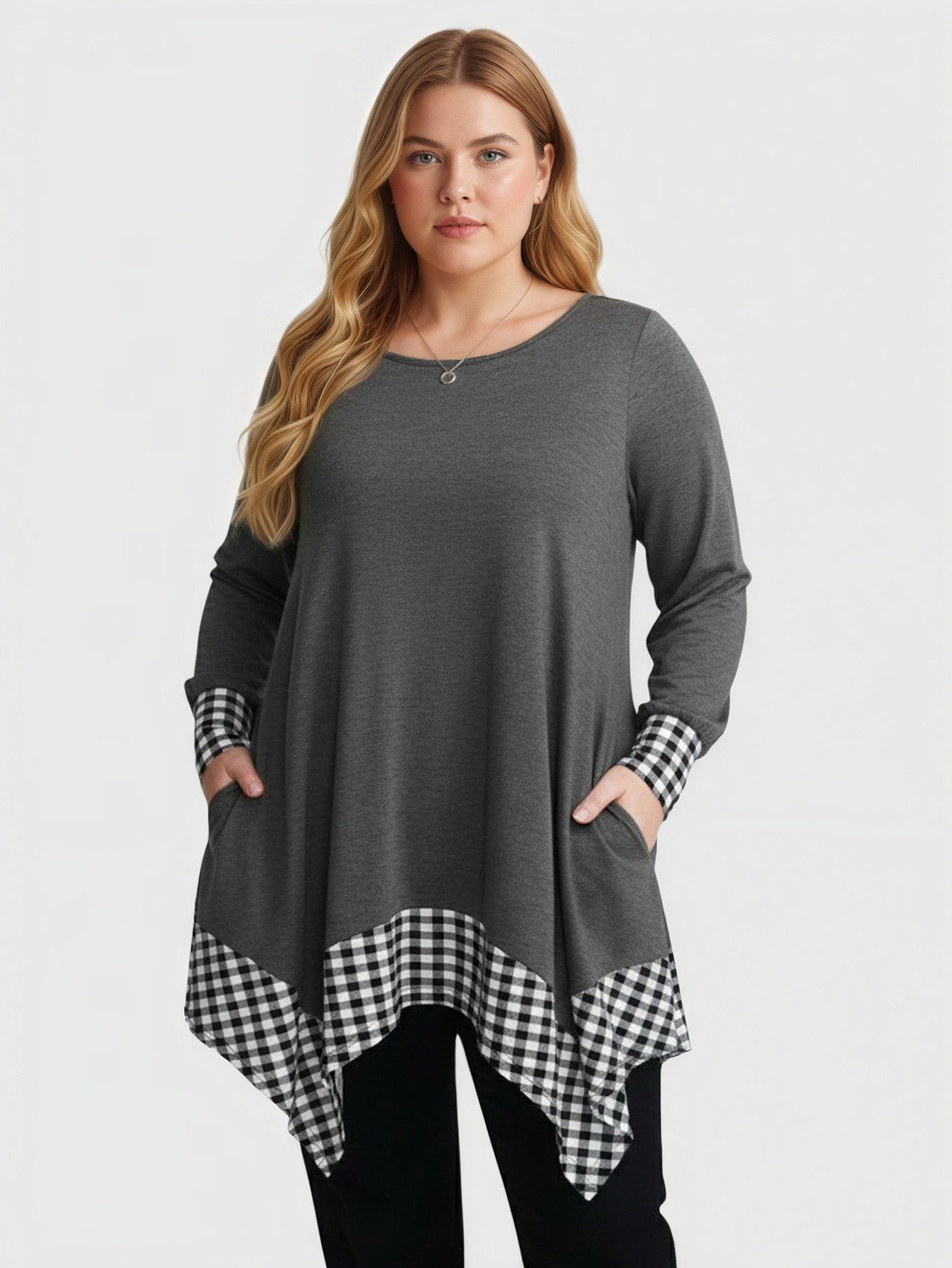 Yeese Damen Plus Size Lässiges Langarmshirt mit asymmetrischem Saum, Tasche und Übergröße