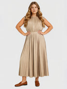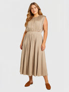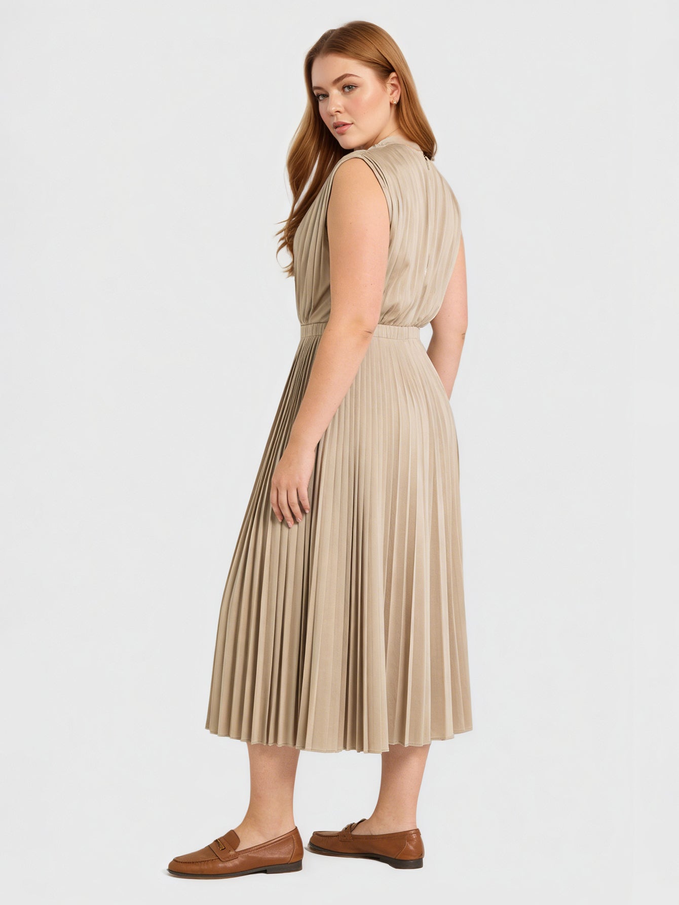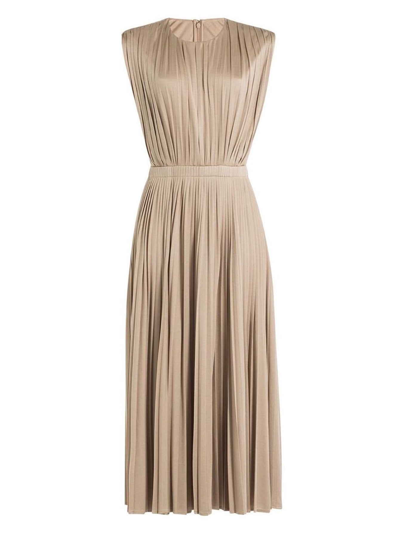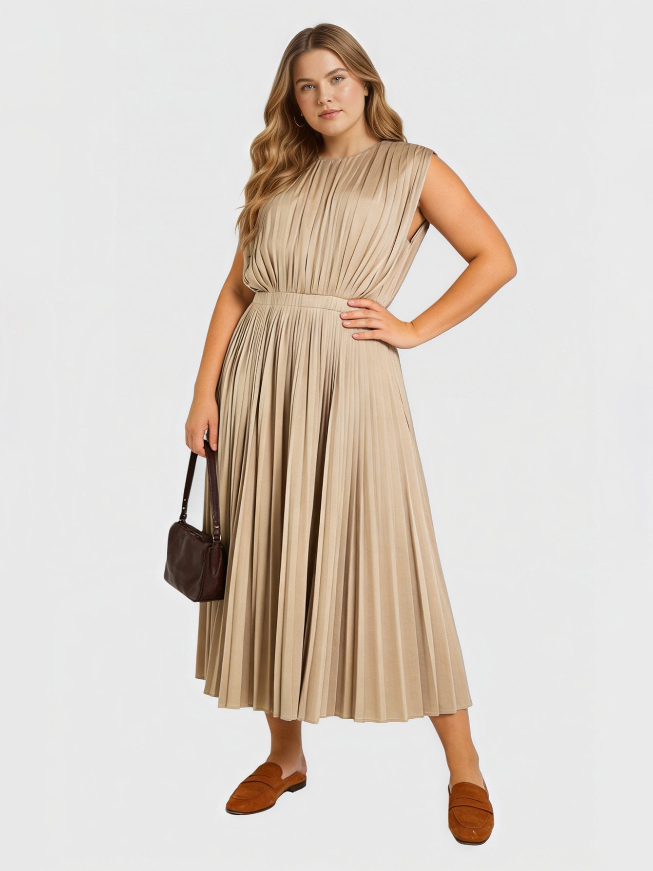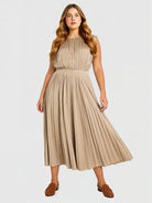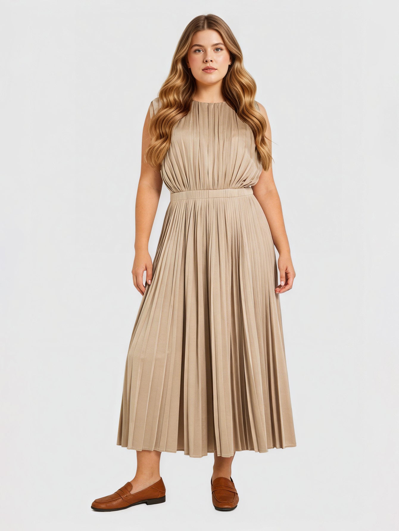 Description: An elegant pleated midi dress with a sleeveless design and round neckline. Made from breathable polyester, it offers a flattering fit for both casual and formal occasions.